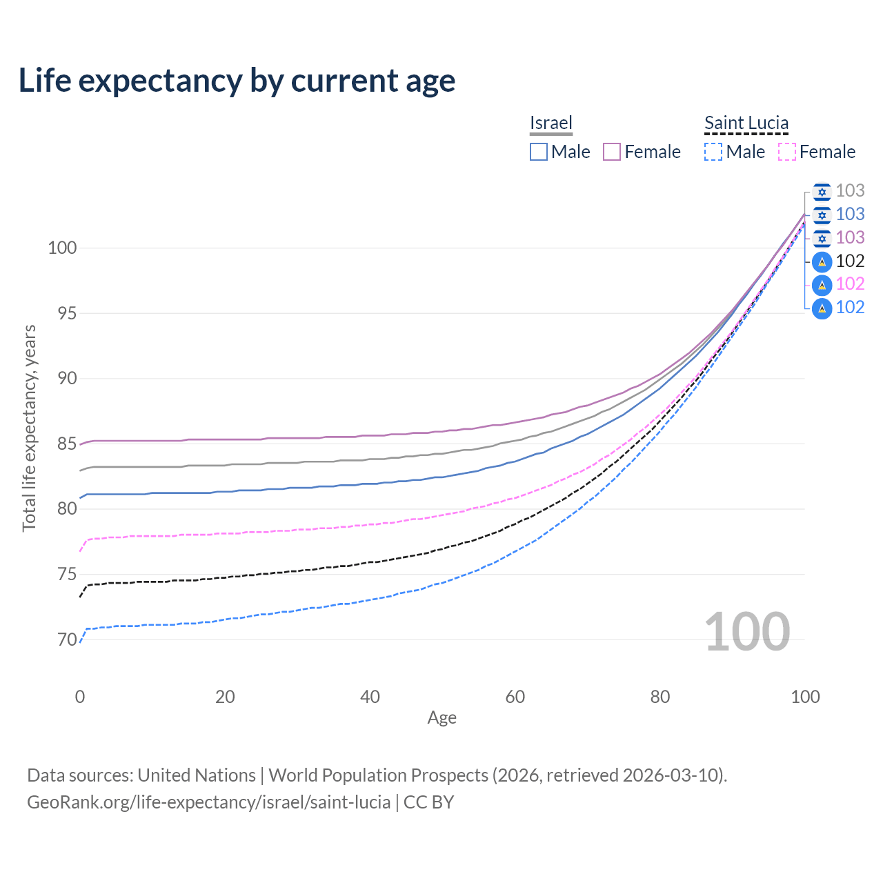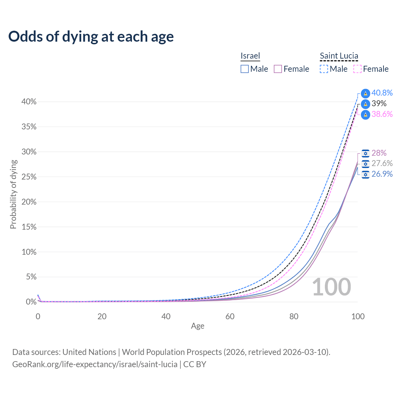 This life expectancy calculator shows the odds of living to 100, 95, 90, and below based on current age for both males and females in Israel and Saint Lucia, along with mean and median age of death. The calculations are based on the 2026 life tables (actuarial tables) from the UN World Population Prospects.