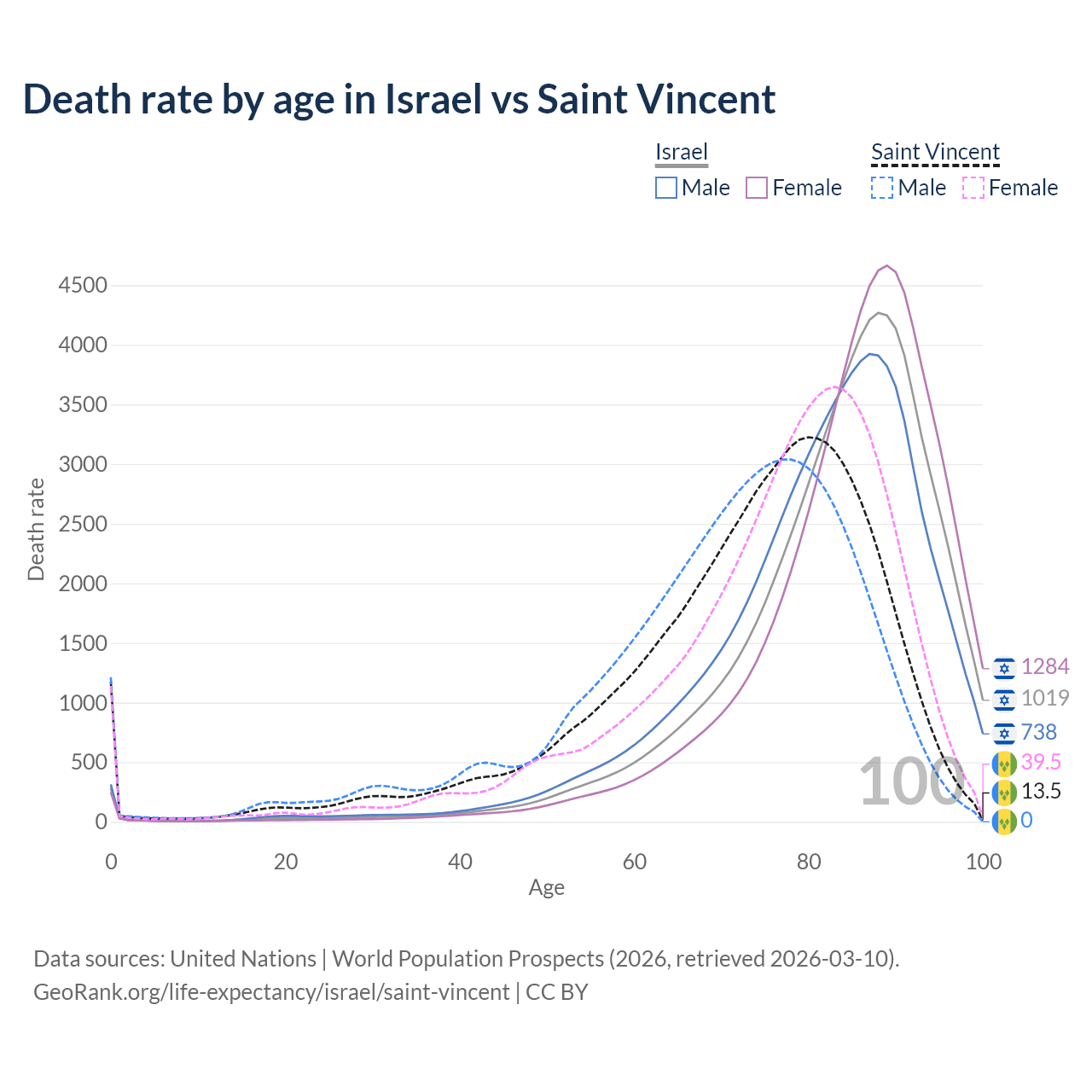 In Israel, the most common age of death is 88, compared to 80 in Saint Vincent. The median age of death is 85.6 in Israel and 75.6 in Saint Vincent, meaning only half of each cohort is expected to live past that age.