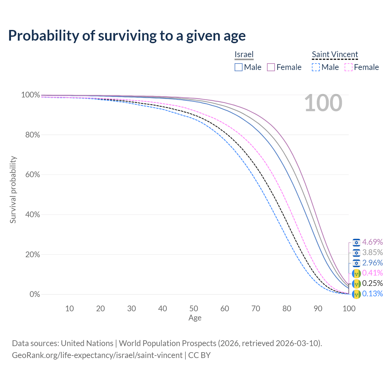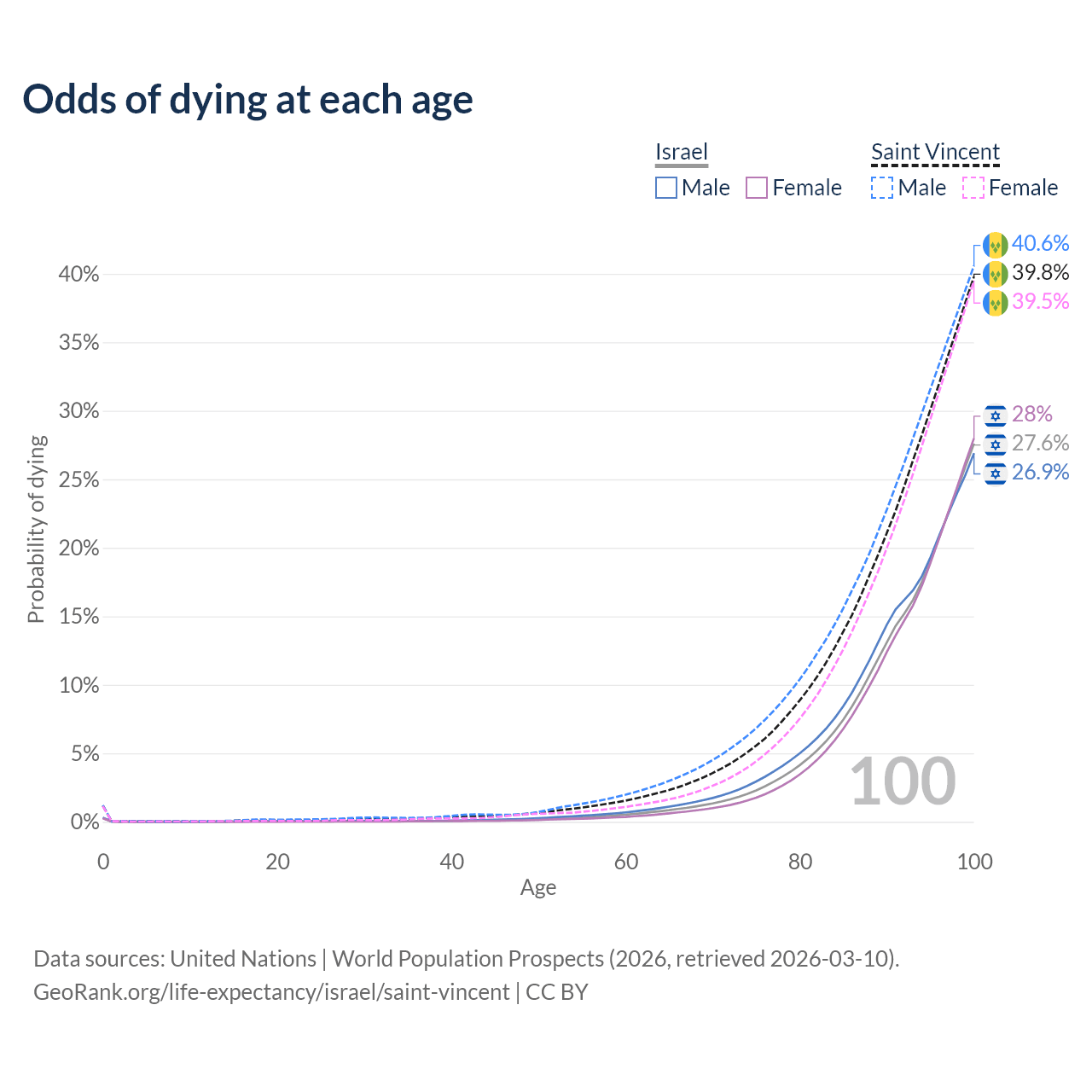 This life expectancy calculator shows the odds of living to 100, 95, 90, and below based on current age for both males and females in Israel and Saint Vincent, along with mean and median age of death. The calculations are based on the 2026 life tables (actuarial tables) from the UN World Population Prospects.