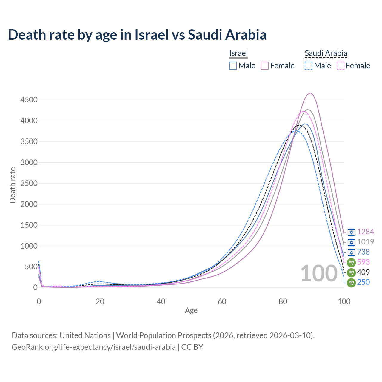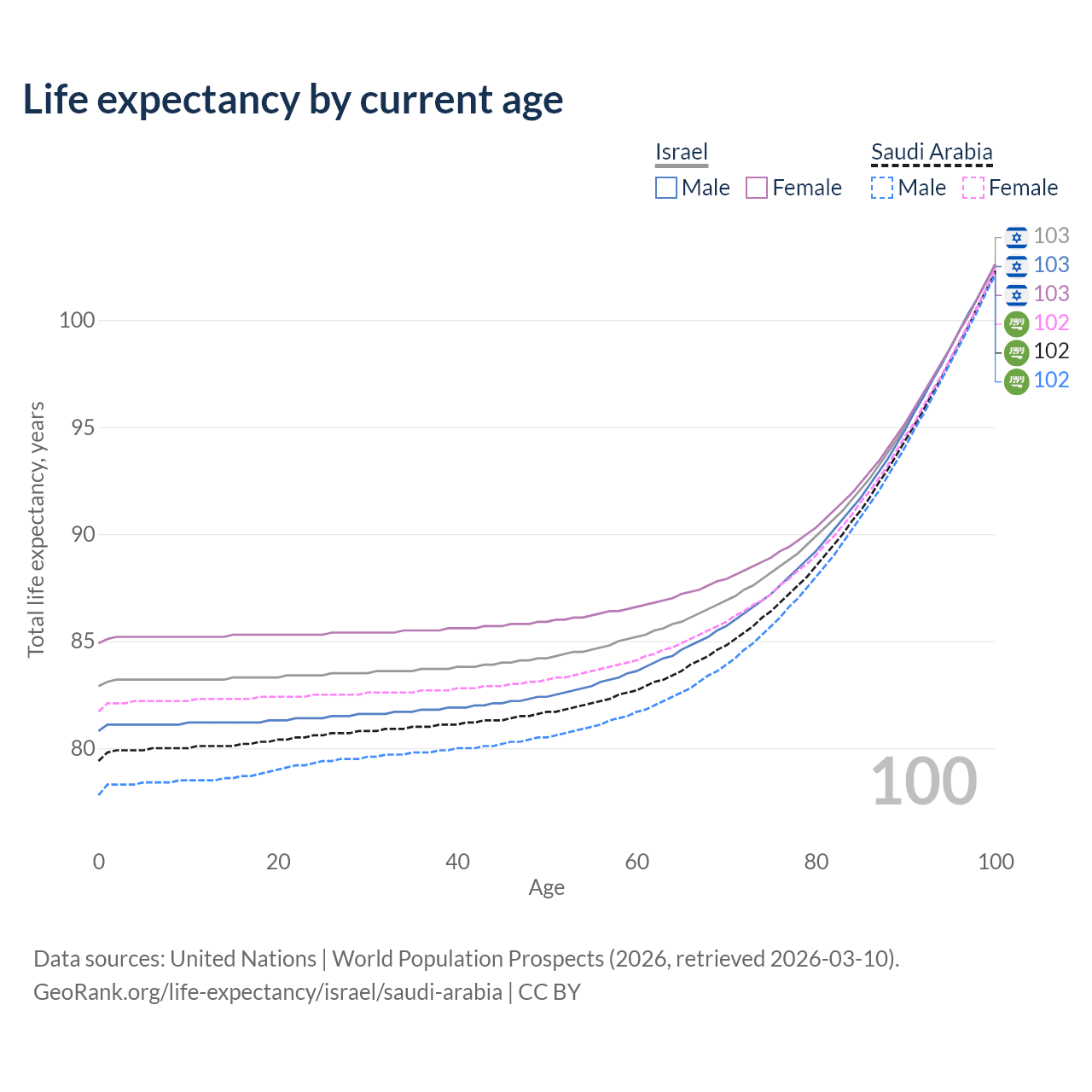 This life expectancy calculator shows the odds of living to 100, 95, 90, and below based on current age for both males and females in Israel and Saudi Arabia, along with mean and median age of death. The calculations are based on the 2026 life tables (actuarial tables) from the UN World Population Prospects.