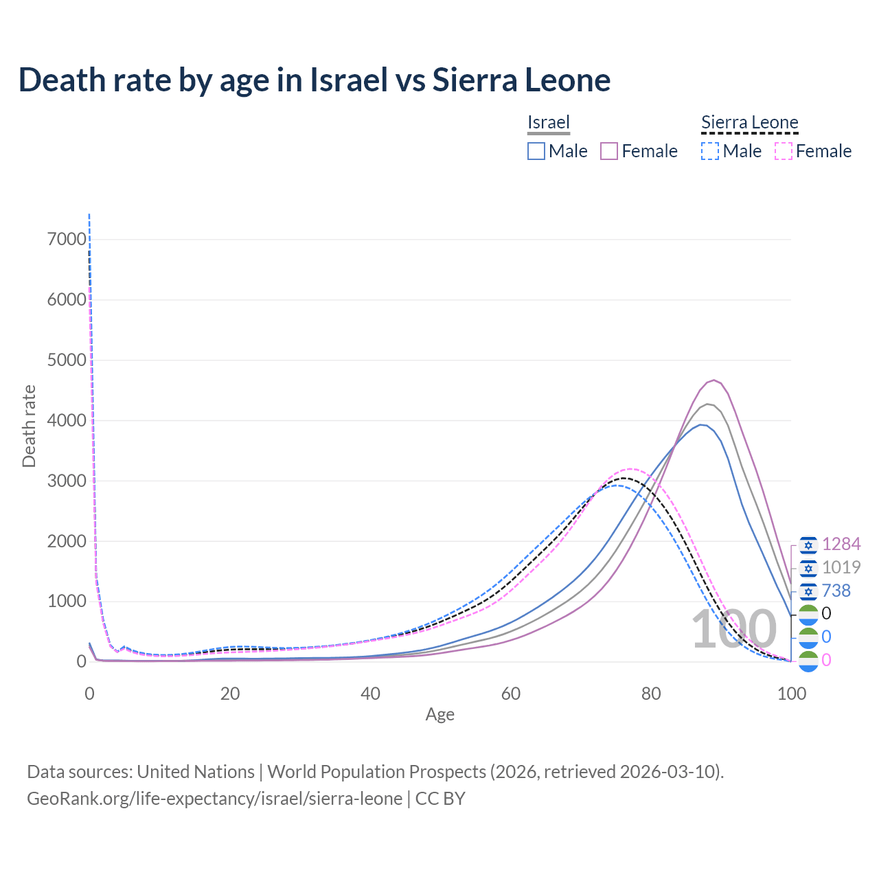 In Israel, the most common age of death is 88, compared to 0 in Sierra Leone. The median age of death is 85.6 in Israel and 70.8 in Sierra Leone, meaning only half of each cohort is expected to live past that age.