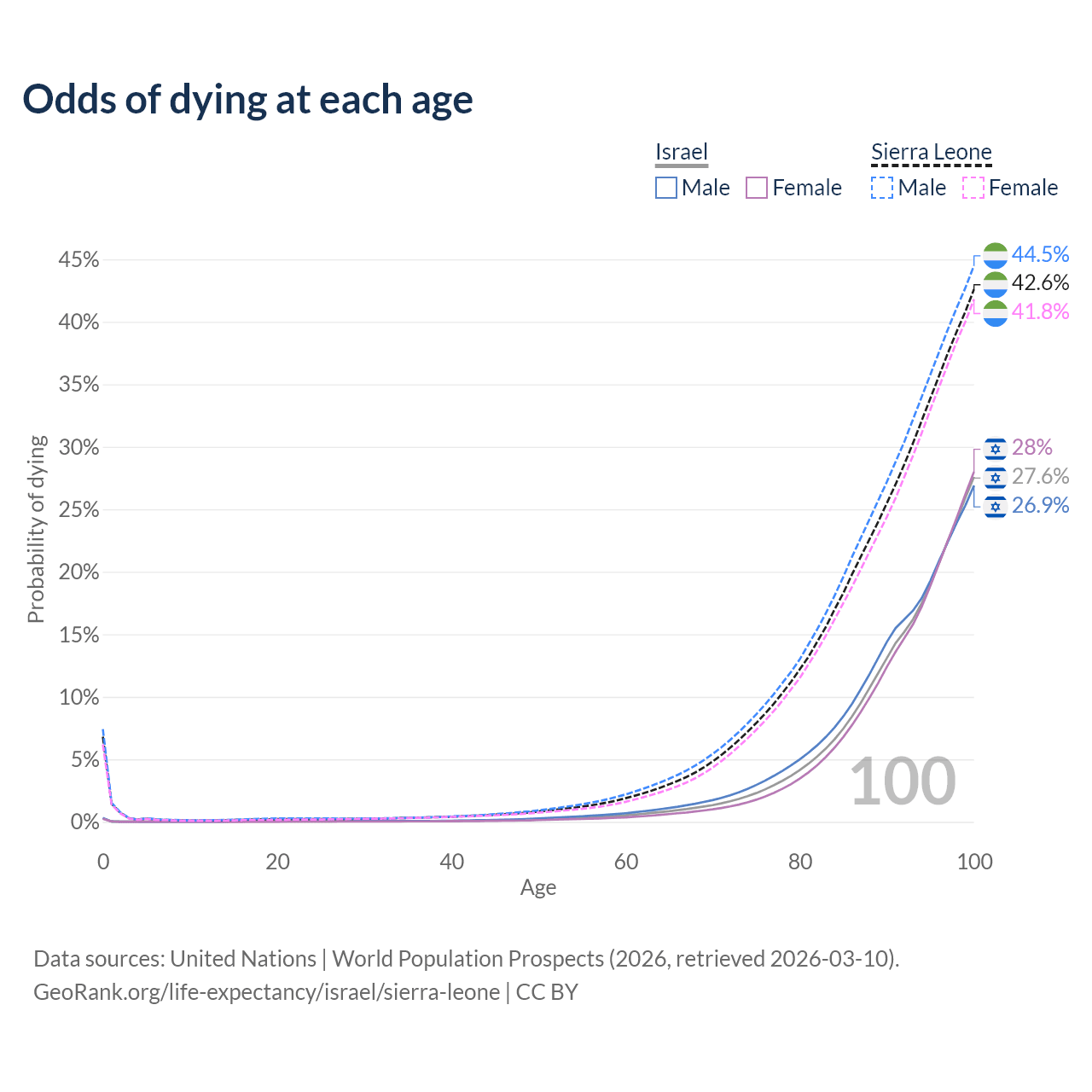 This life expectancy calculator shows the odds of living to 100, 95, 90, and below based on current age for both males and females in Israel and Sierra Leone, along with mean and median age of death. The calculations are based on the 2026 life tables (actuarial tables) from the UN World Population Prospects.