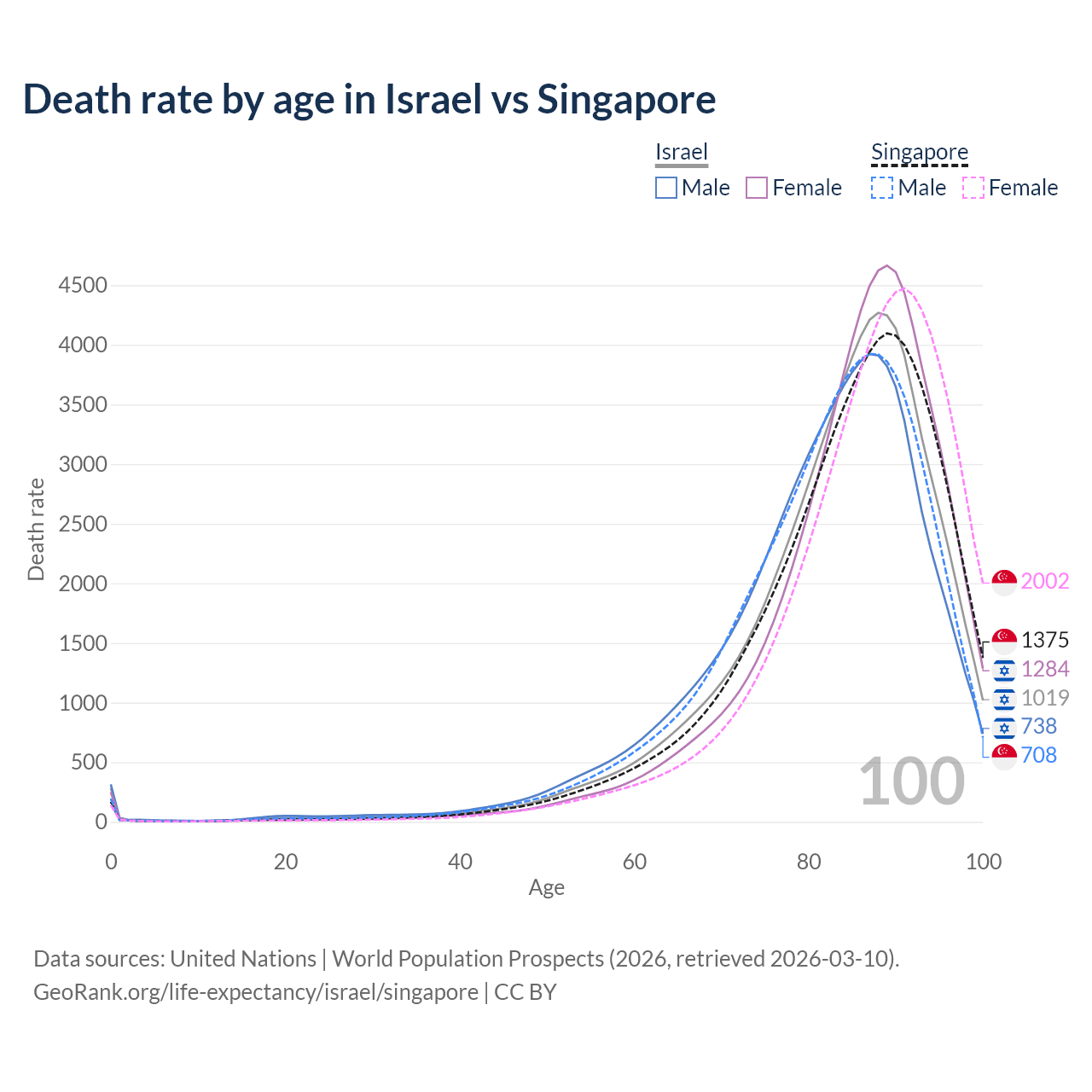 This life expectancy calculator shows the odds of living to 100, 95, 90, and below based on current age for both males and females in Israel and Singapore, along with mean and median age of death. The calculations are based on the 2026 life tables (actuarial tables) from the UN World Population Prospects.