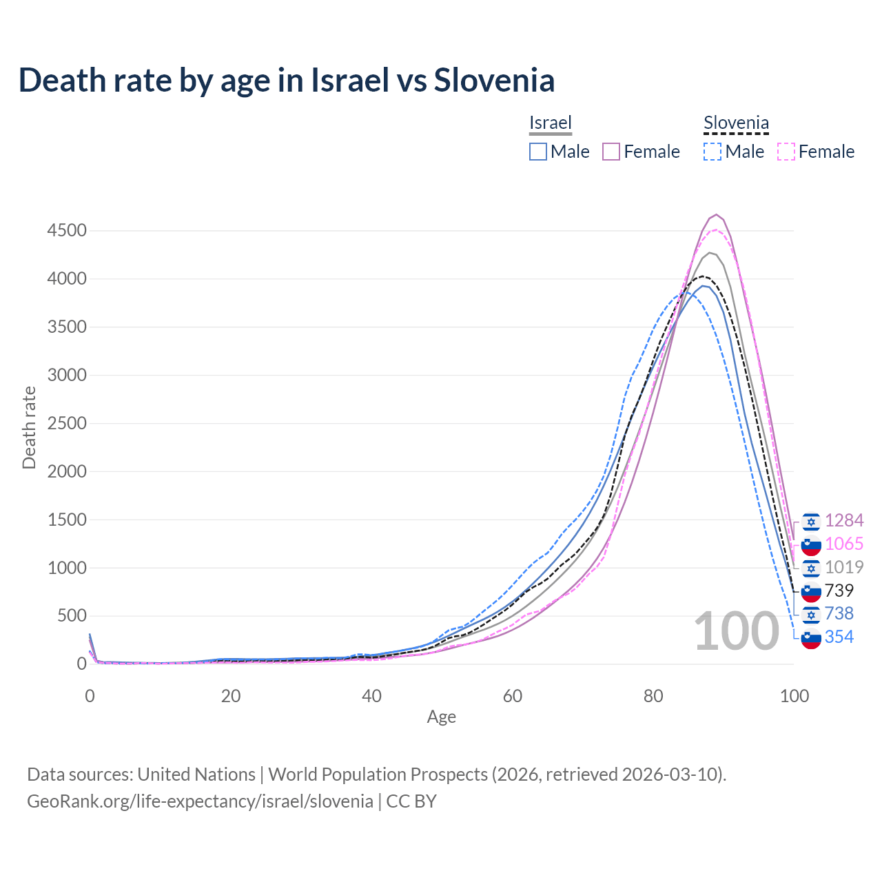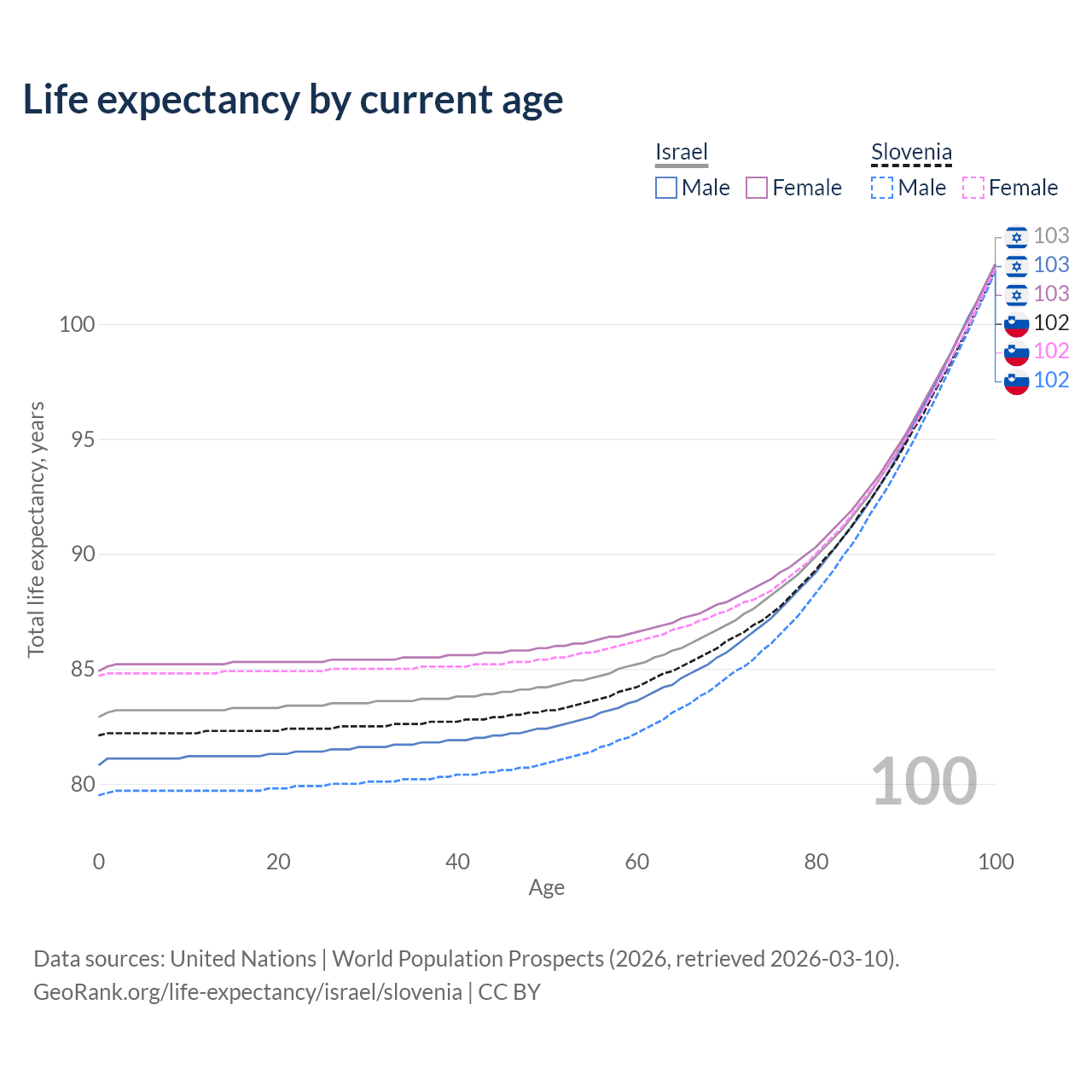 This life expectancy calculator shows the odds of living to 100, 95, 90, and below based on current age for both males and females in Israel and Slovenia, along with mean and median age of death. The calculations are based on the 2026 life tables (actuarial tables) from the UN World Population Prospects.