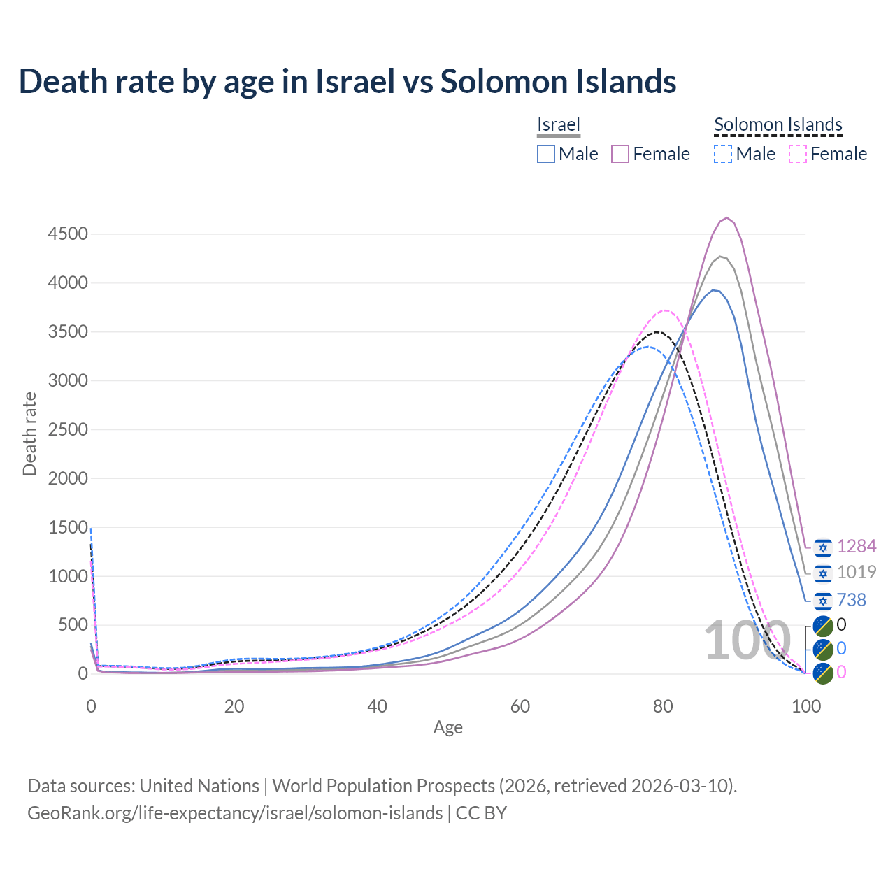 In Israel, the most common age of death is 88, compared to 79 in the Solomon Islands. The median age of death is 85.6 in Israel and 74.9 in the Solomon Islands, meaning only half of each cohort is expected to live past that age.