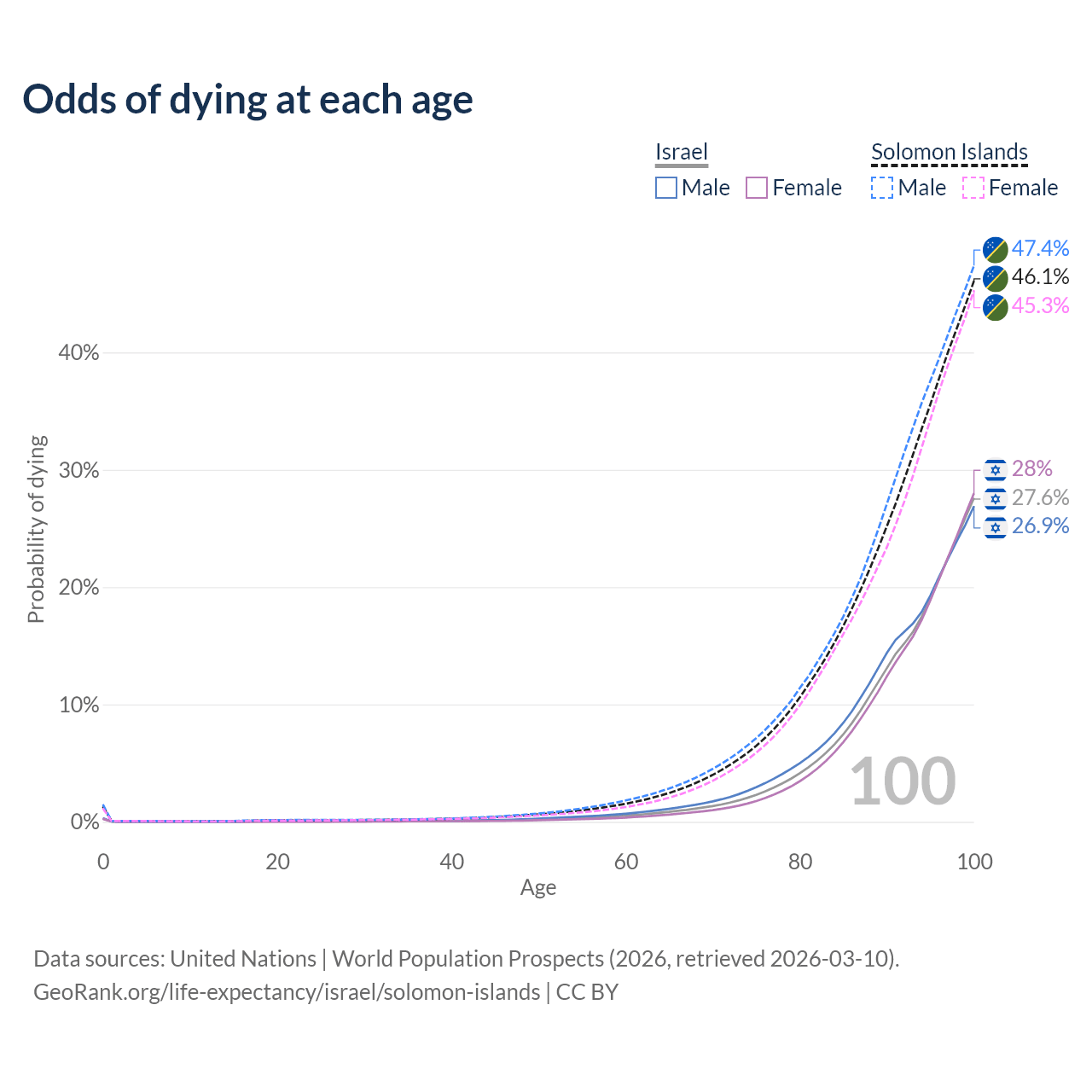This life expectancy calculator shows the odds of living to 100, 95, 90, and below based on current age for both males and females in Israel and the Solomon Islands, along with mean and median age of death. The calculations are based on the 2026 life tables (actuarial tables) from the UN World Population Prospects.