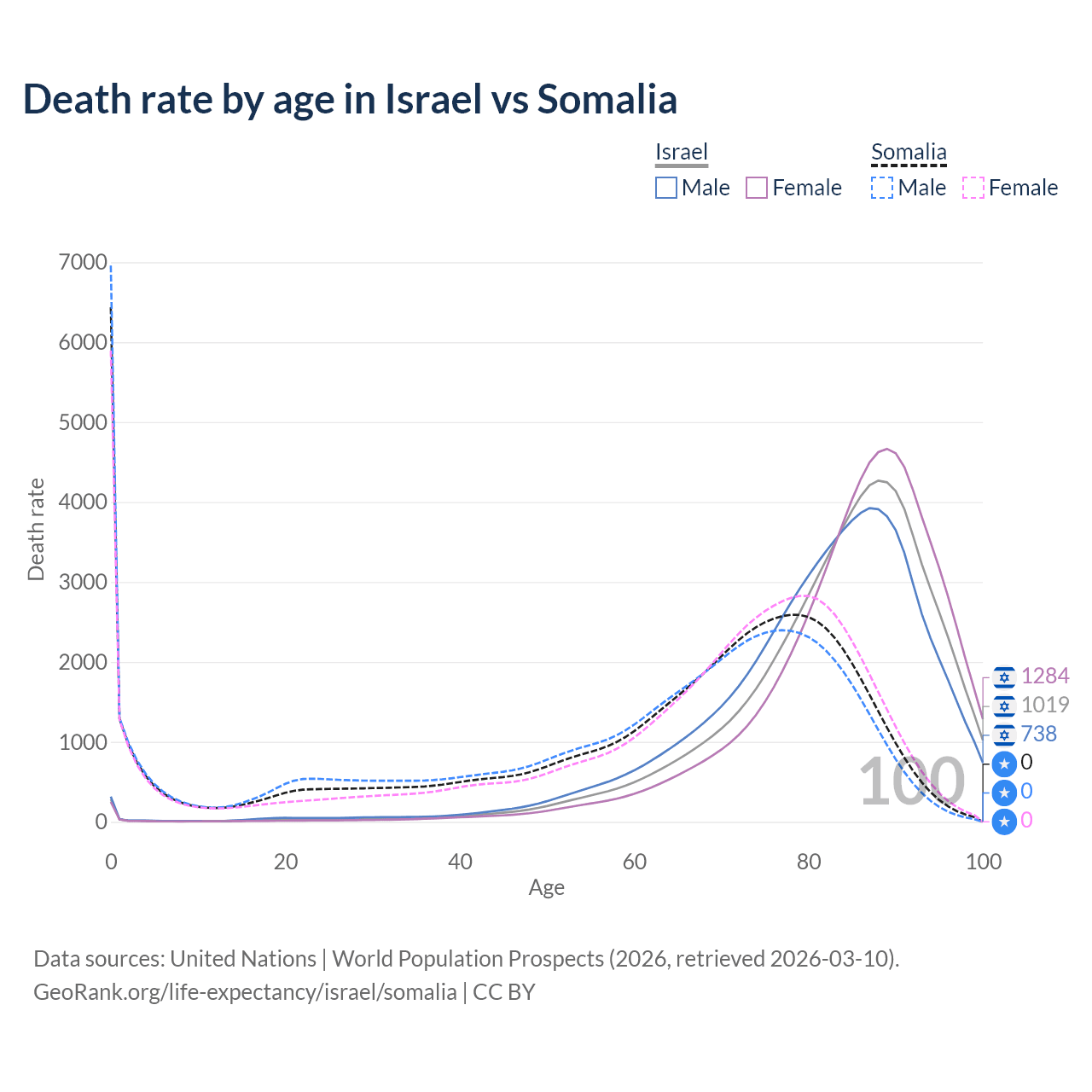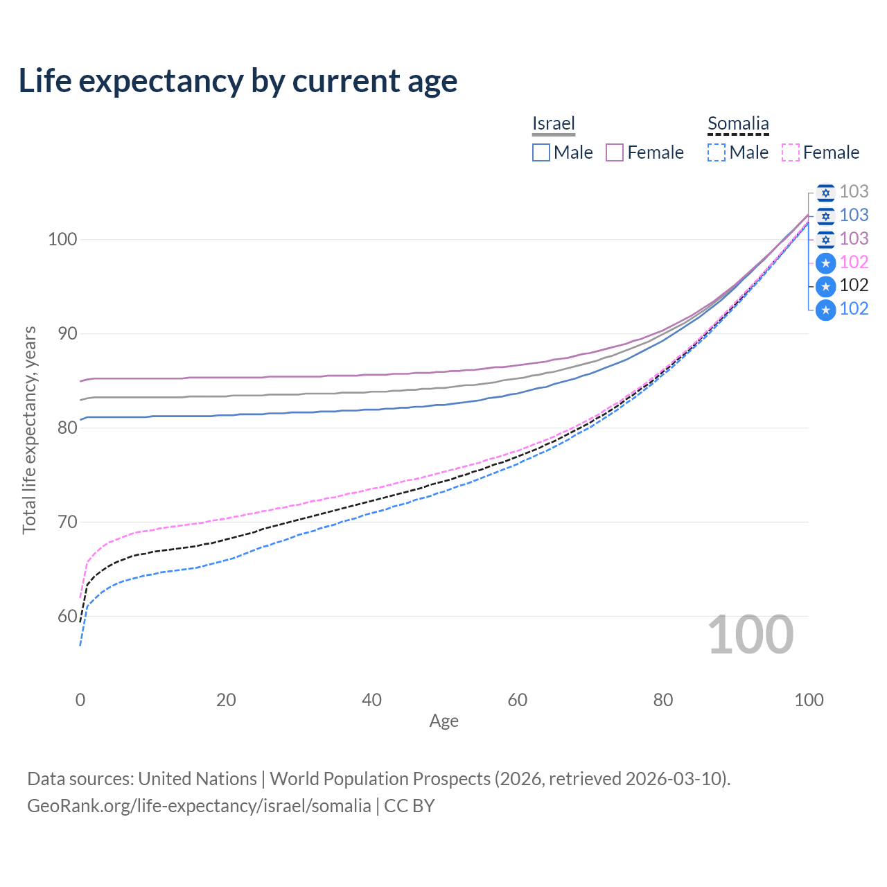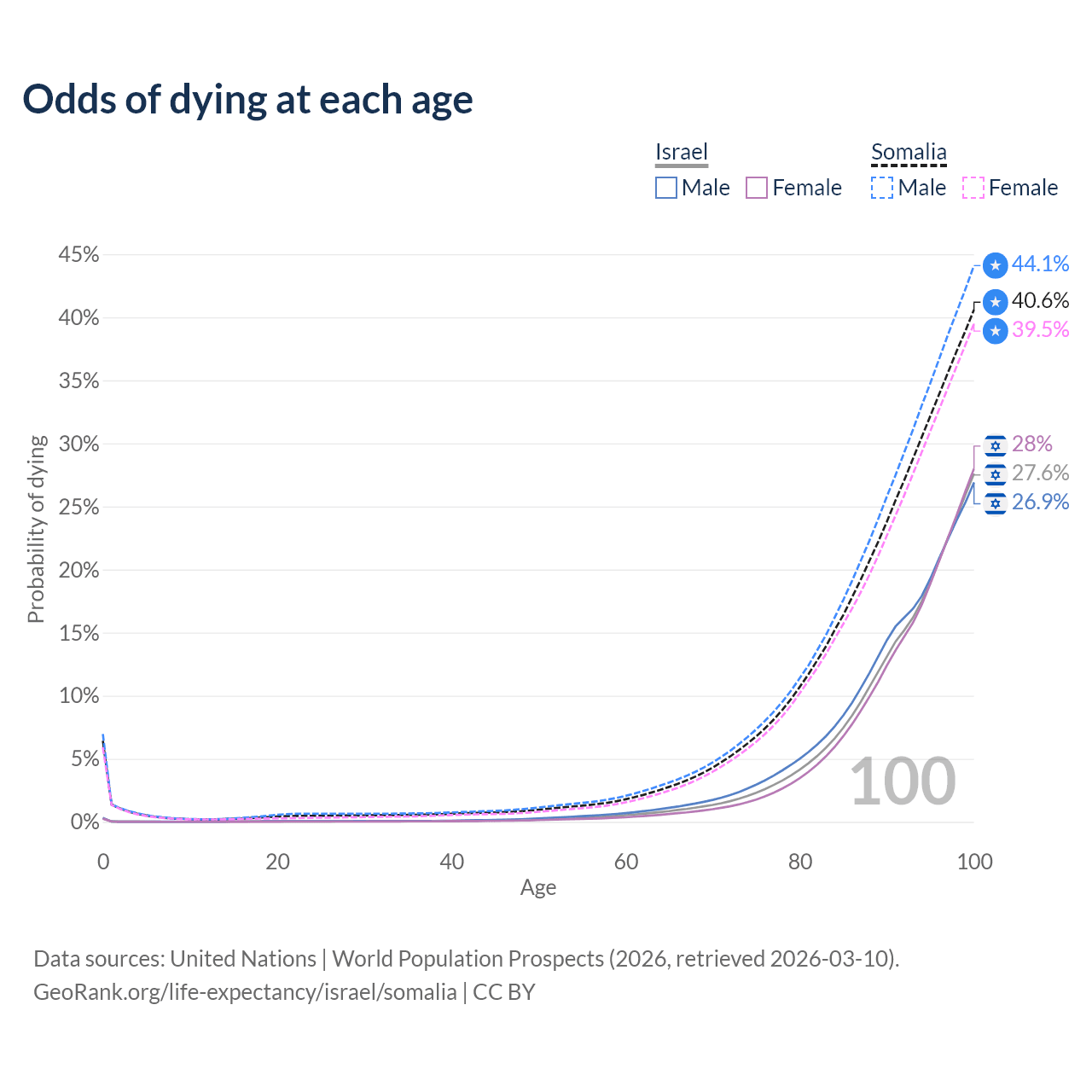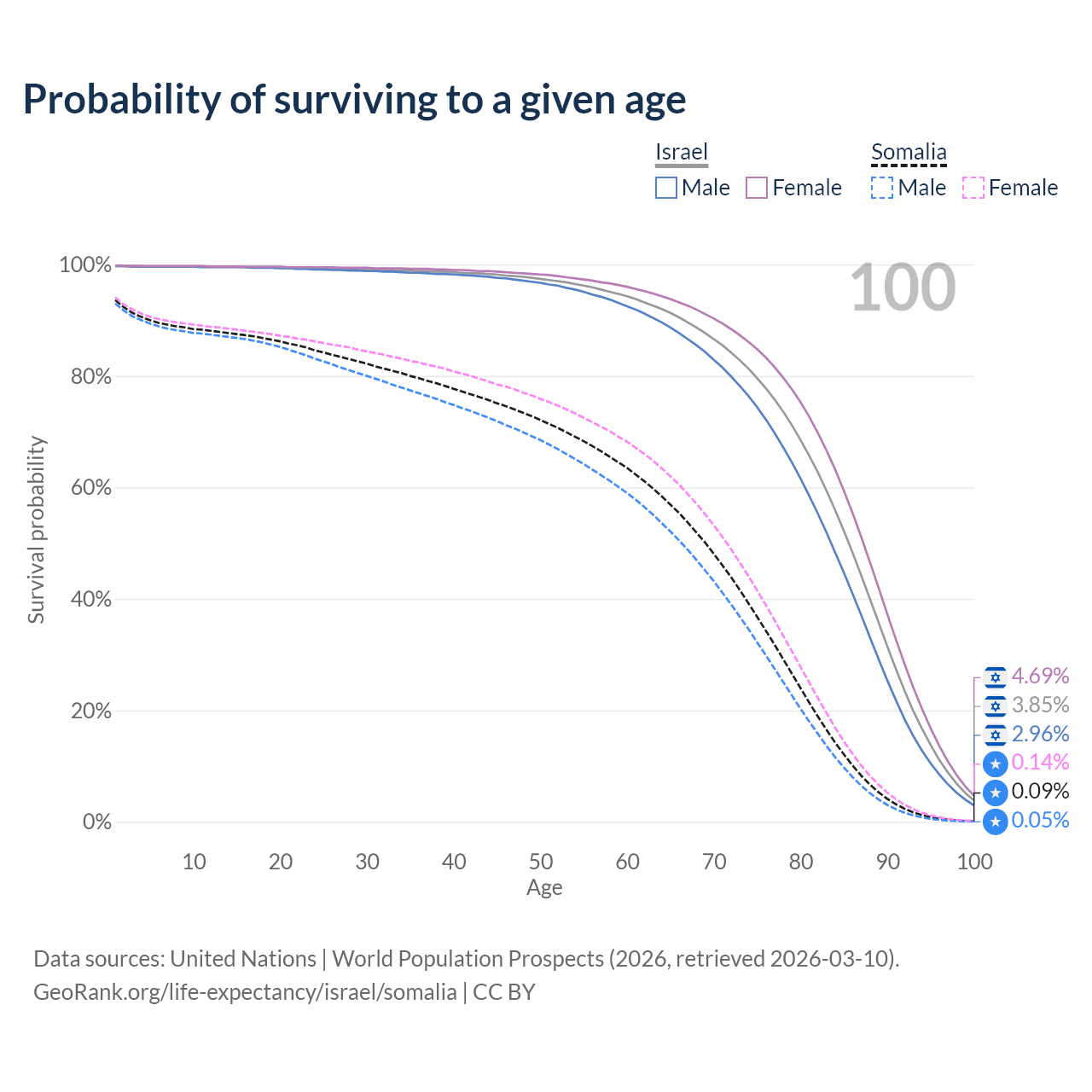 This life expectancy calculator shows the odds of living to 100, 95, 90, and below based on current age for both males and females in Israel and Somalia, along with mean and median age of death. The calculations are based on the 2026 life tables (actuarial tables) from the UN World Population Prospects.