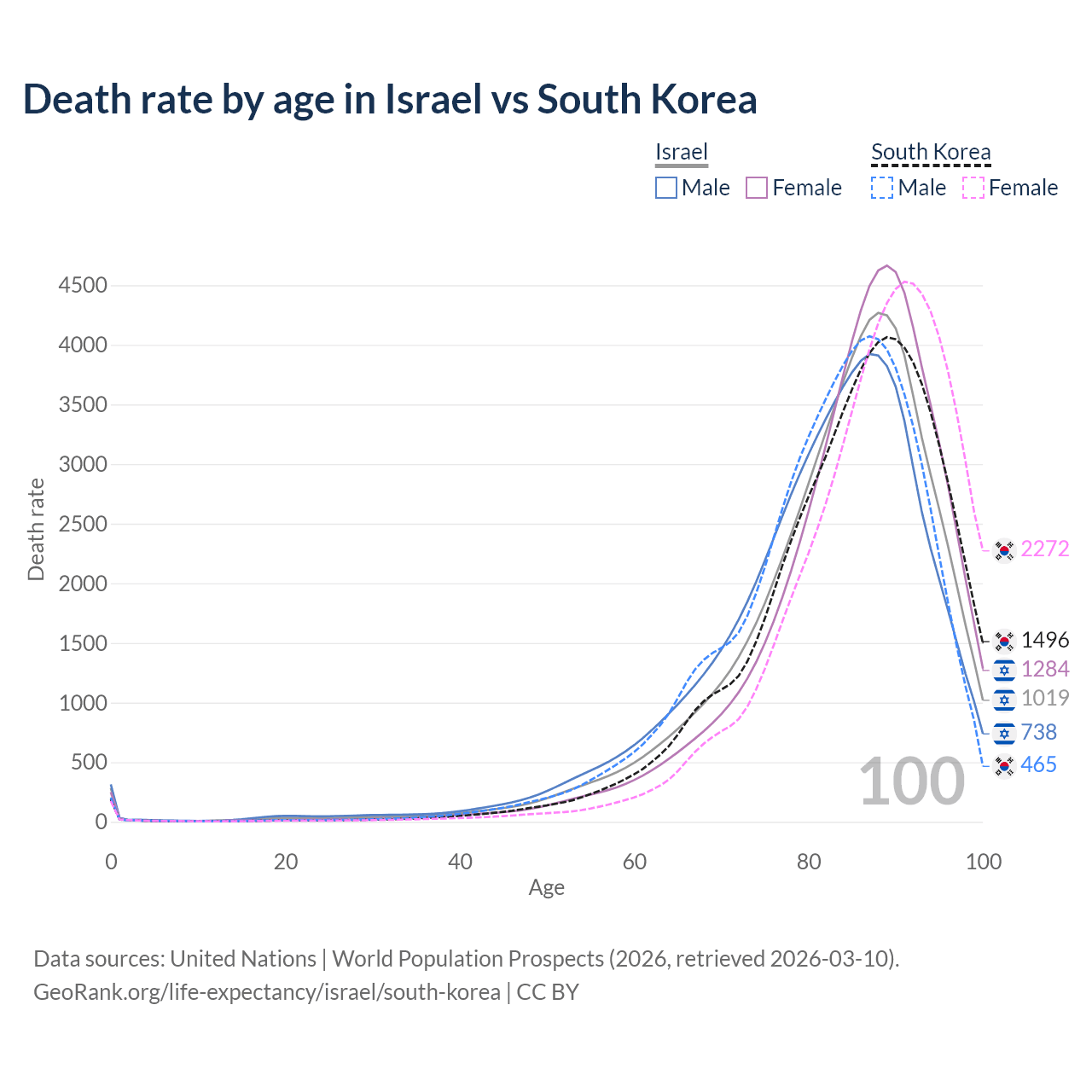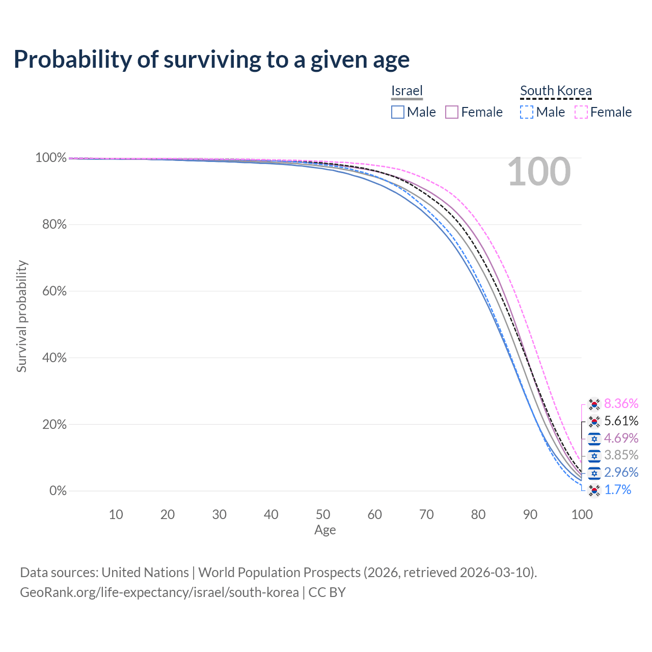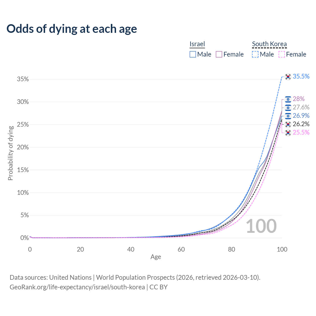 This life expectancy calculator shows the odds of living to 100, 95, 90, and below based on current age for both males and females in Israel and South Korea, along with mean and median age of death. The calculations are based on the 2026 life tables (actuarial tables) from the UN World Population Prospects.