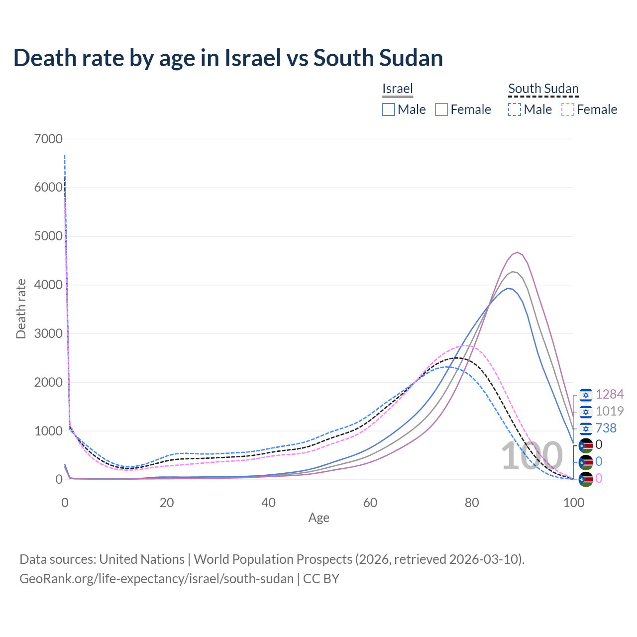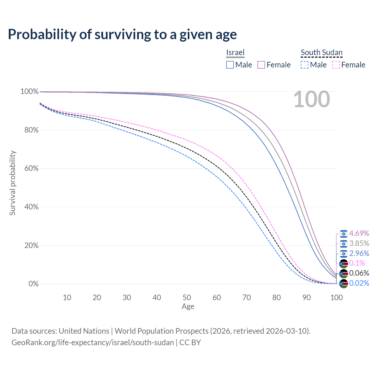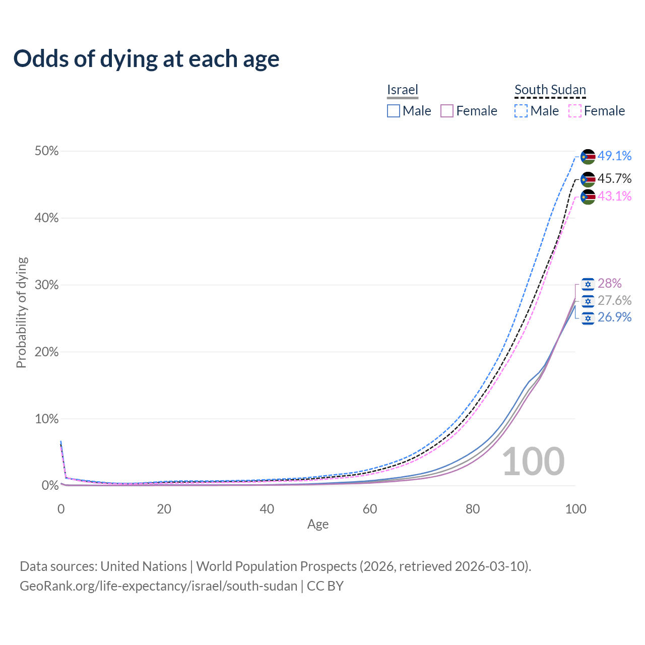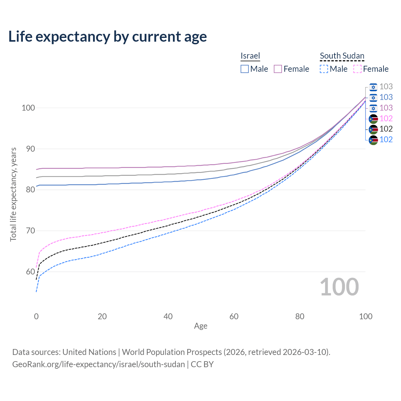This life expectancy calculator shows the odds of living to 100, 95, 90, and below based on current age for both males and females in Israel and South Sudan, along with mean and median age of death. The calculations are based on the 2026 life tables (actuarial tables) from the UN World Population Prospects.