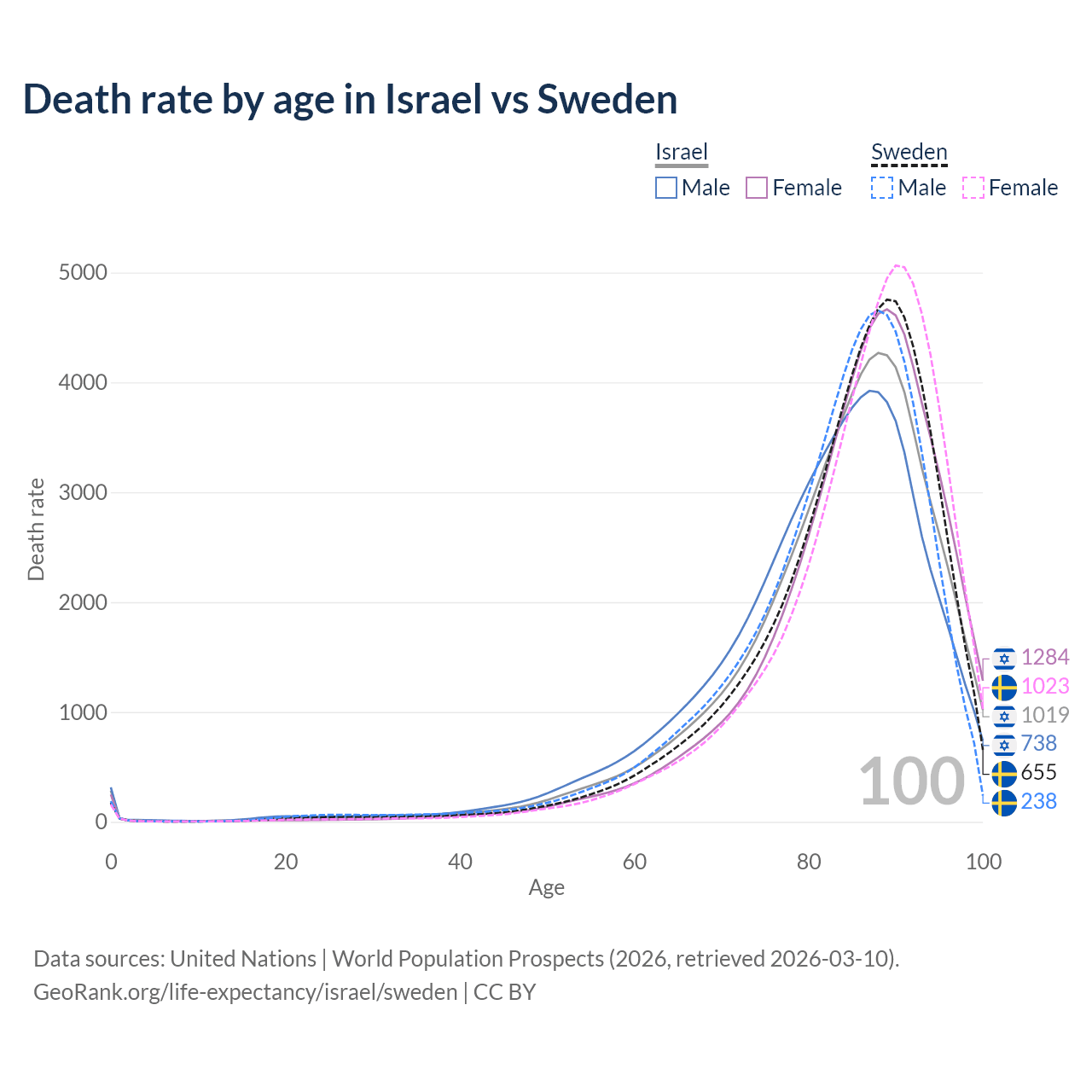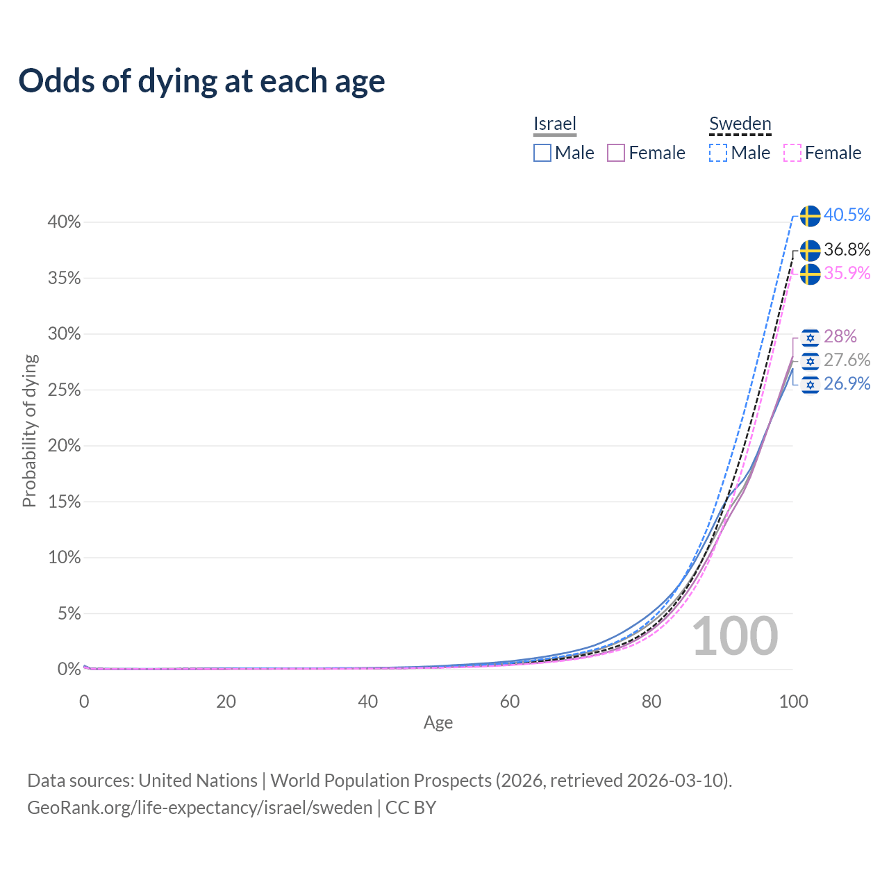 This life expectancy calculator shows the odds of living to 100, 95, 90, and below based on current age for both males and females in Israel and Sweden, along with mean and median age of death. The calculations are based on the 2026 life tables (actuarial tables) from the UN World Population Prospects.