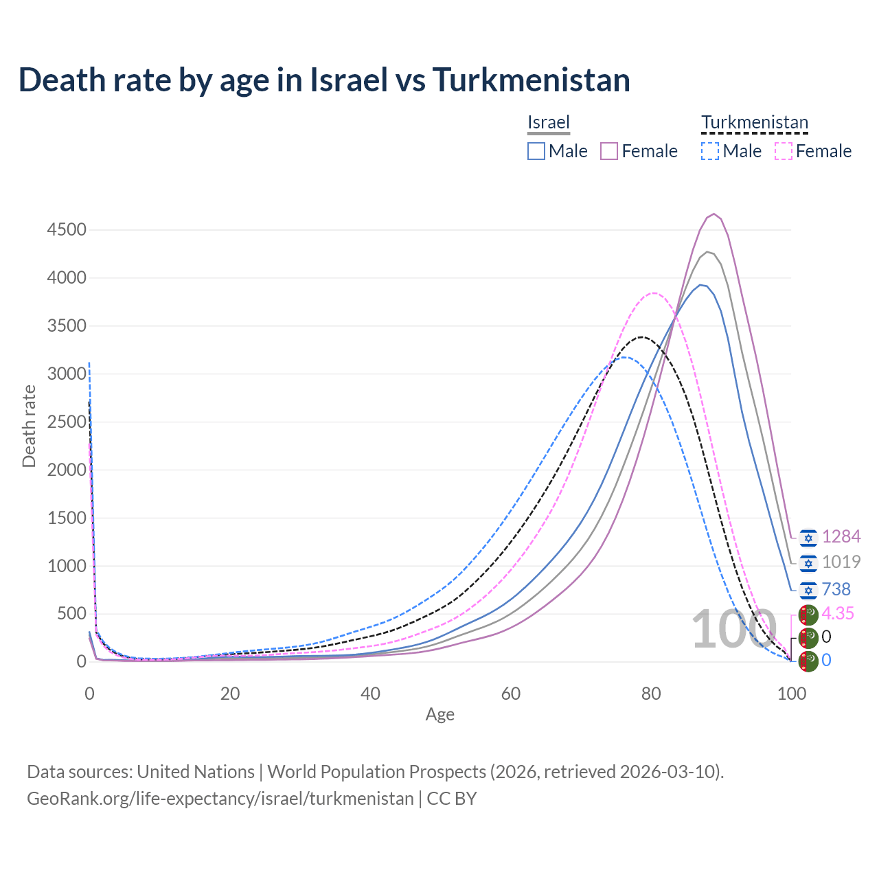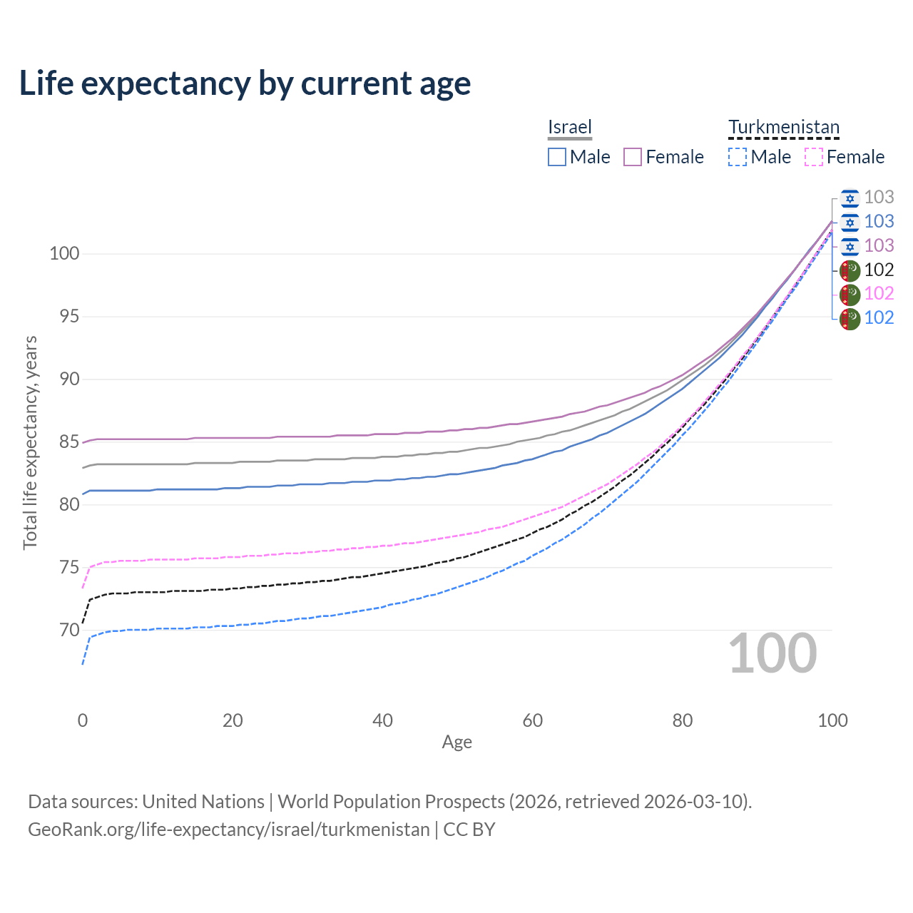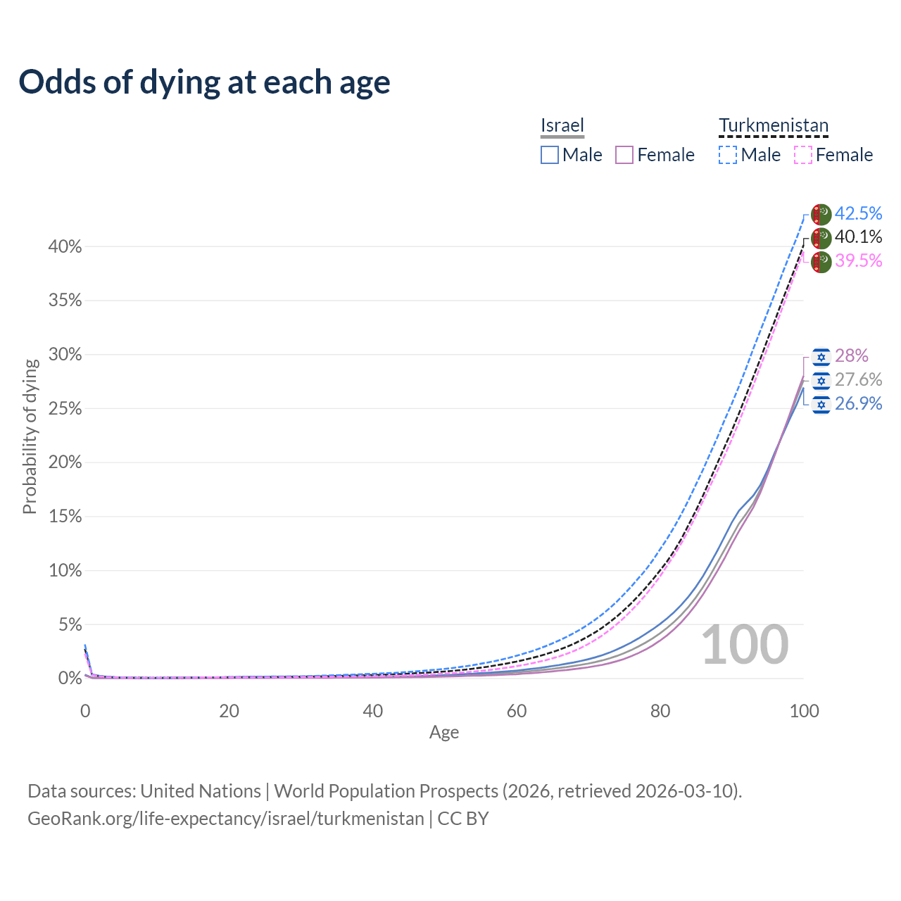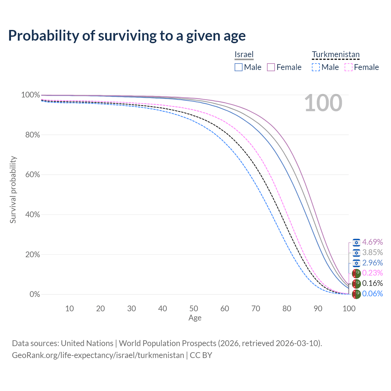 This life expectancy calculator shows the odds of living to 100, 95, 90, and below based on current age for both males and females in Israel and Turkmenistan, along with mean and median age of death. The calculations are based on the 2026 life tables (actuarial tables) from the UN World Population Prospects.