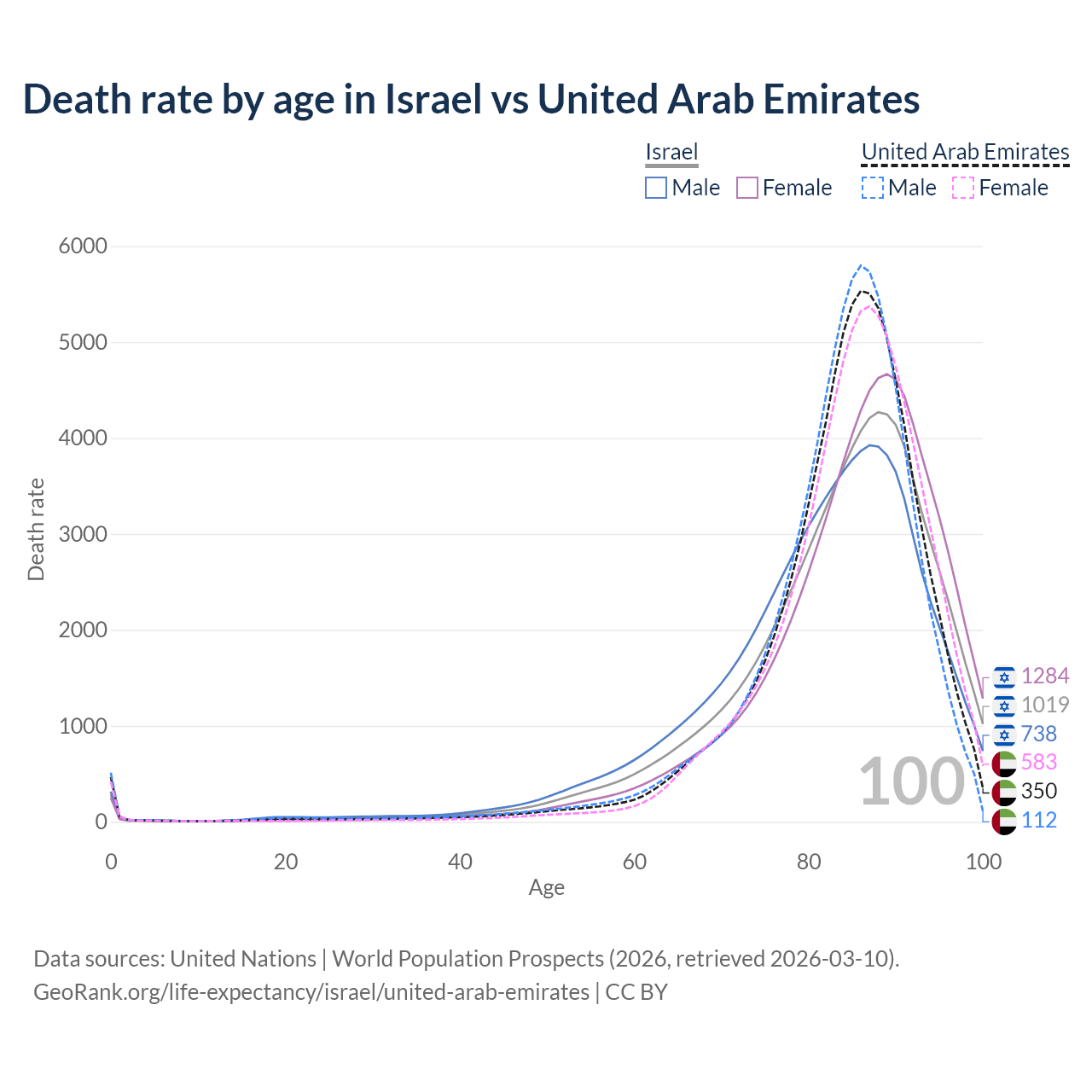 In Israel, the most common age of death is 88, compared to 86 in the United Arab Emirates. The median age of death is 85.6 in Israel and 85.6 in the United Arab Emirates, meaning only half of each cohort is expected to live past that age.