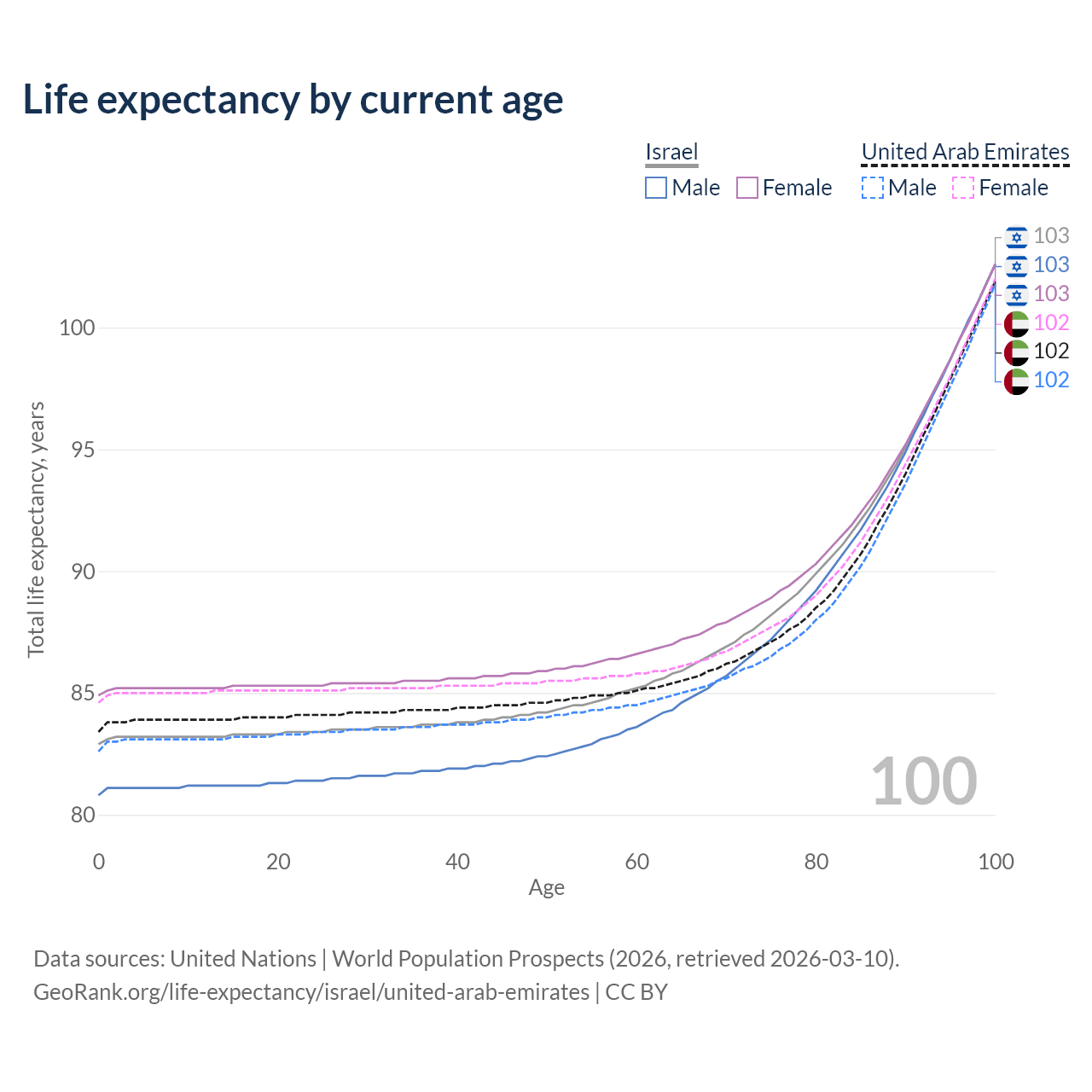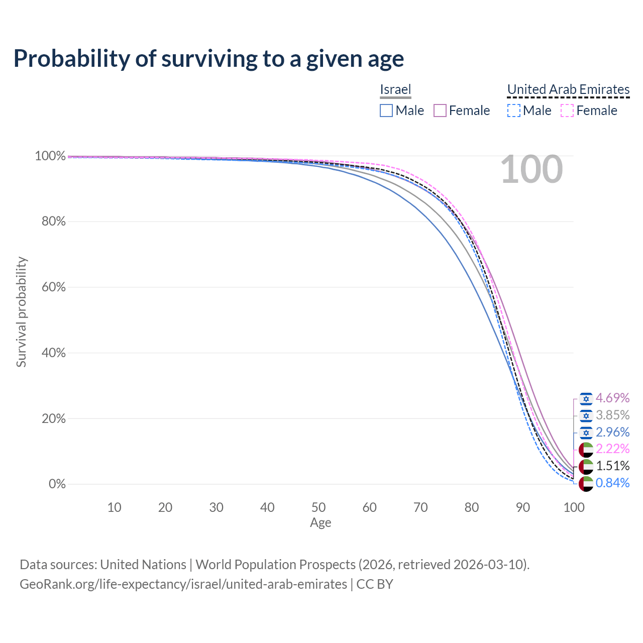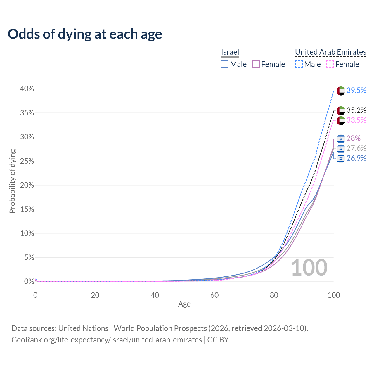 This life expectancy calculator shows the odds of living to 100, 95, 90, and below based on current age for both males and females in Israel and the United Arab Emirates, along with mean and median age of death. The calculations are based on the 2026 life tables (actuarial tables) from the UN World Population Prospects.