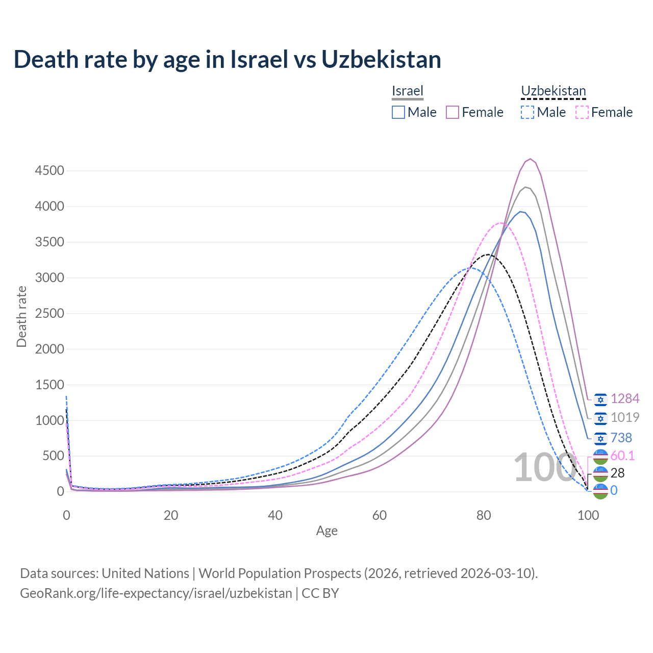 In Israel, the most common age of death is 88, compared to 81 in Uzbekistan. The median age of death is 85.6 in Israel and 76.4 in Uzbekistan, meaning only half of each cohort is expected to live past that age.