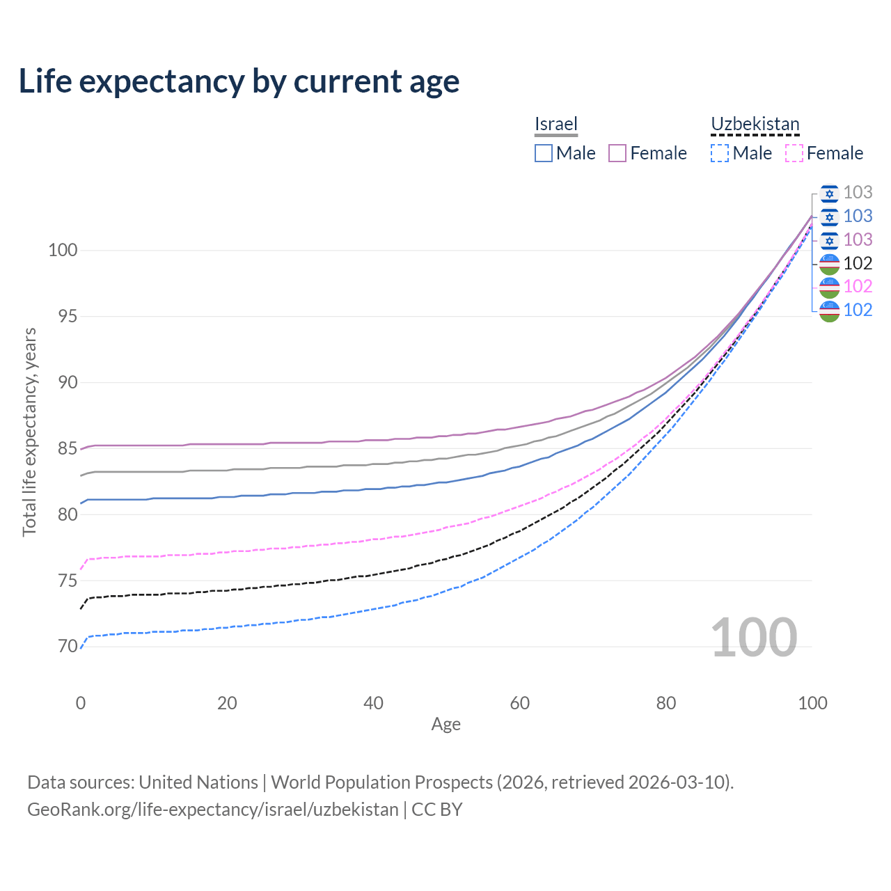 This life expectancy calculator shows the odds of living to 100, 95, 90, and below based on current age for both males and females in Israel and Uzbekistan, along with mean and median age of death. The calculations are based on the 2026 life tables (actuarial tables) from the UN World Population Prospects.