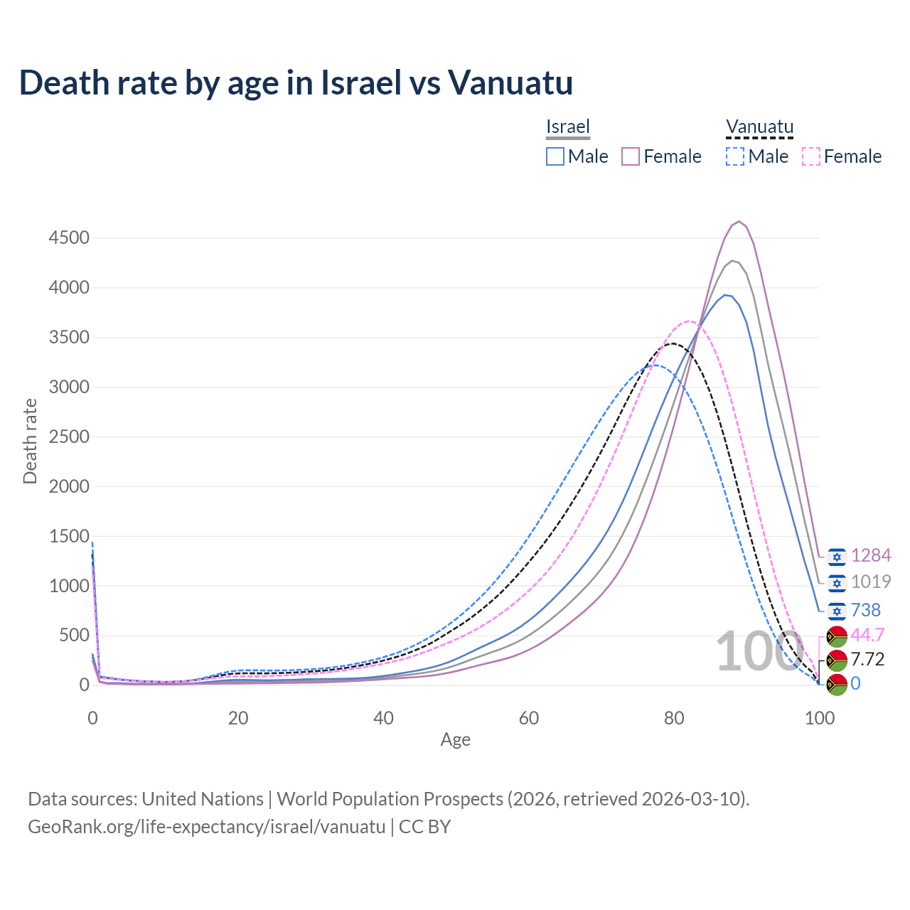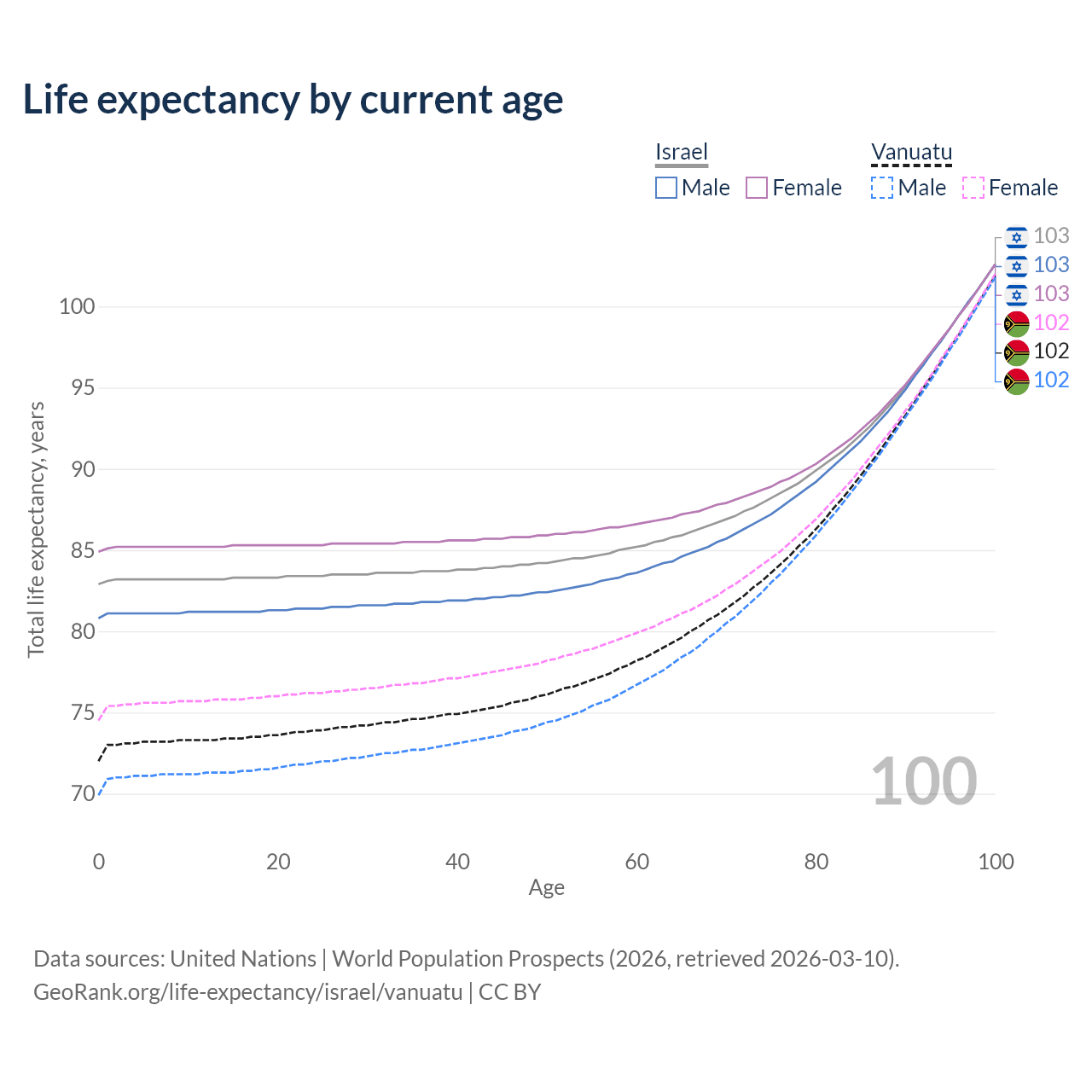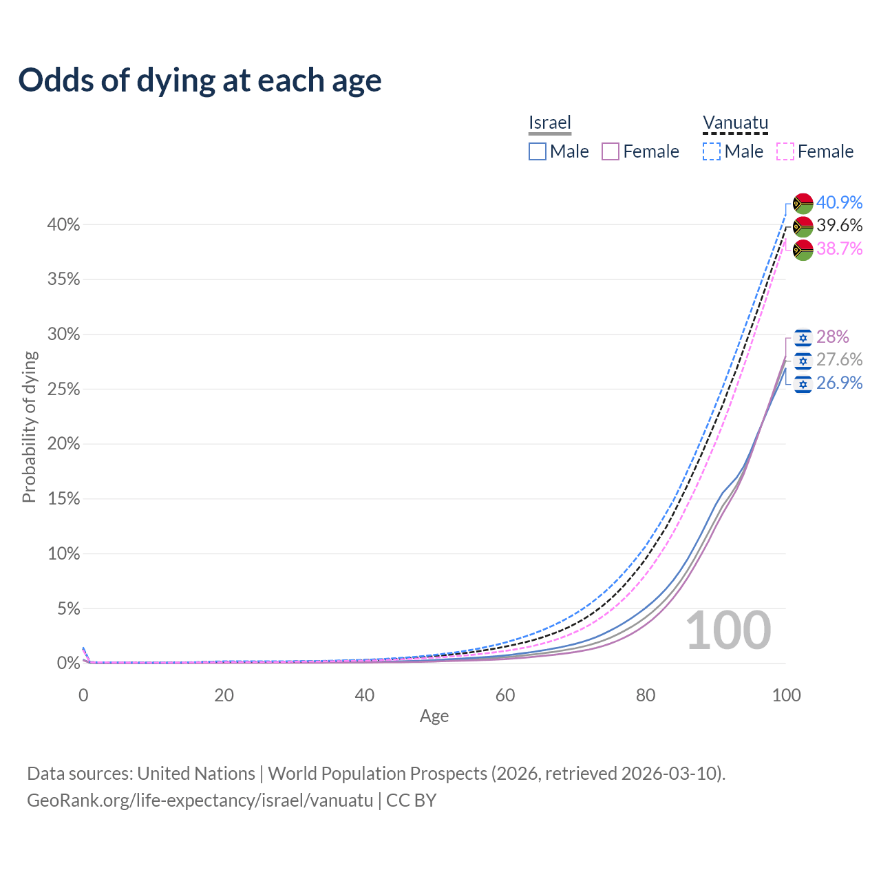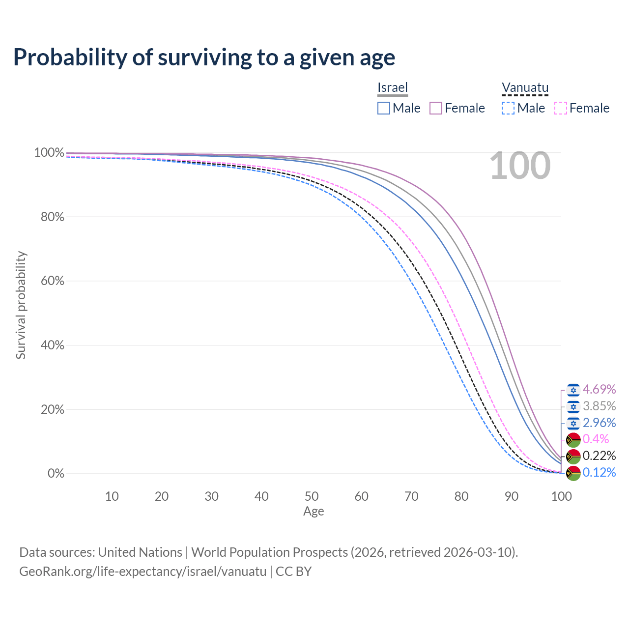 This life expectancy calculator shows the odds of living to 100, 95, 90, and below based on current age for both males and females in Israel and Vanuatu, along with mean and median age of death. The calculations are based on the 2026 life tables (actuarial tables) from the UN World Population Prospects.