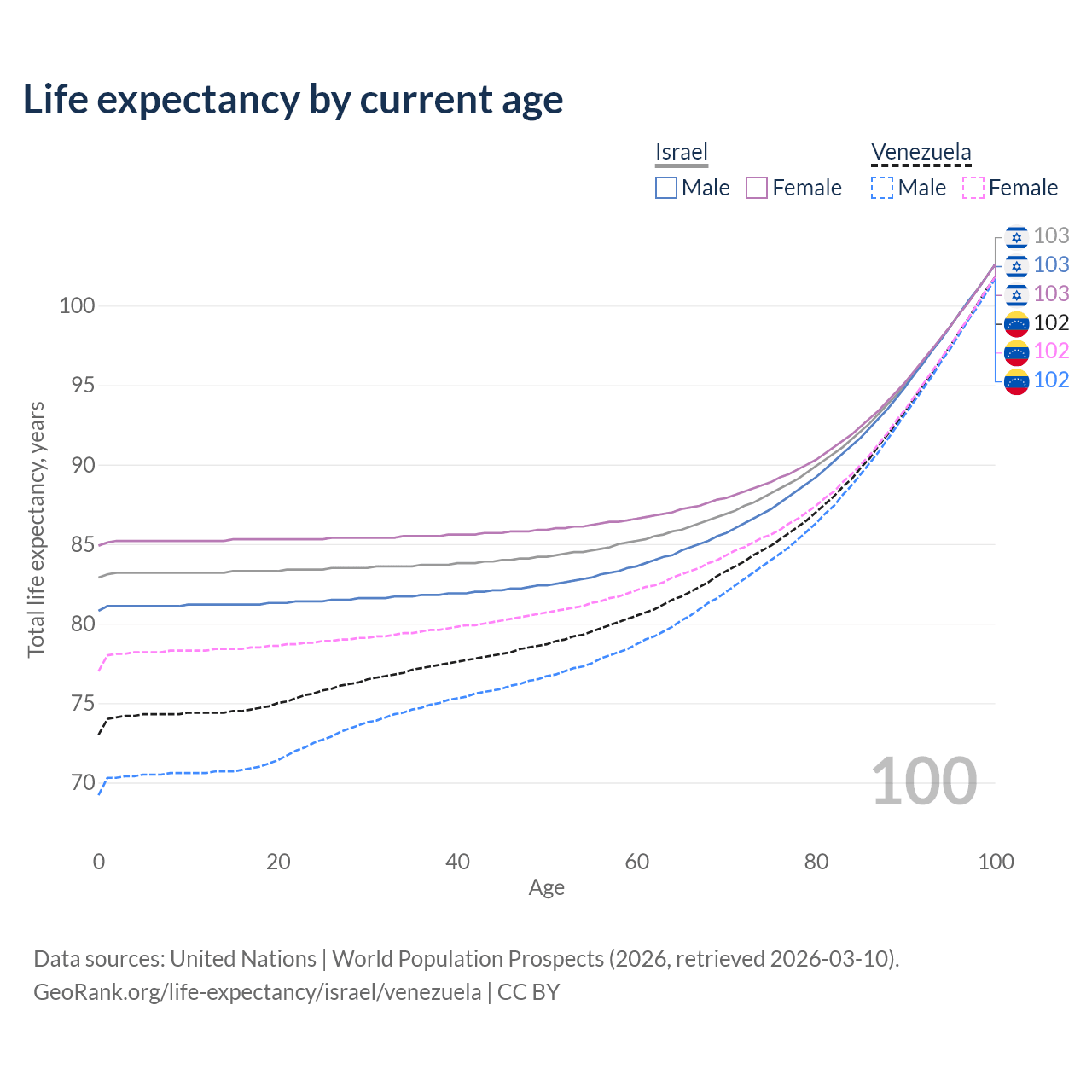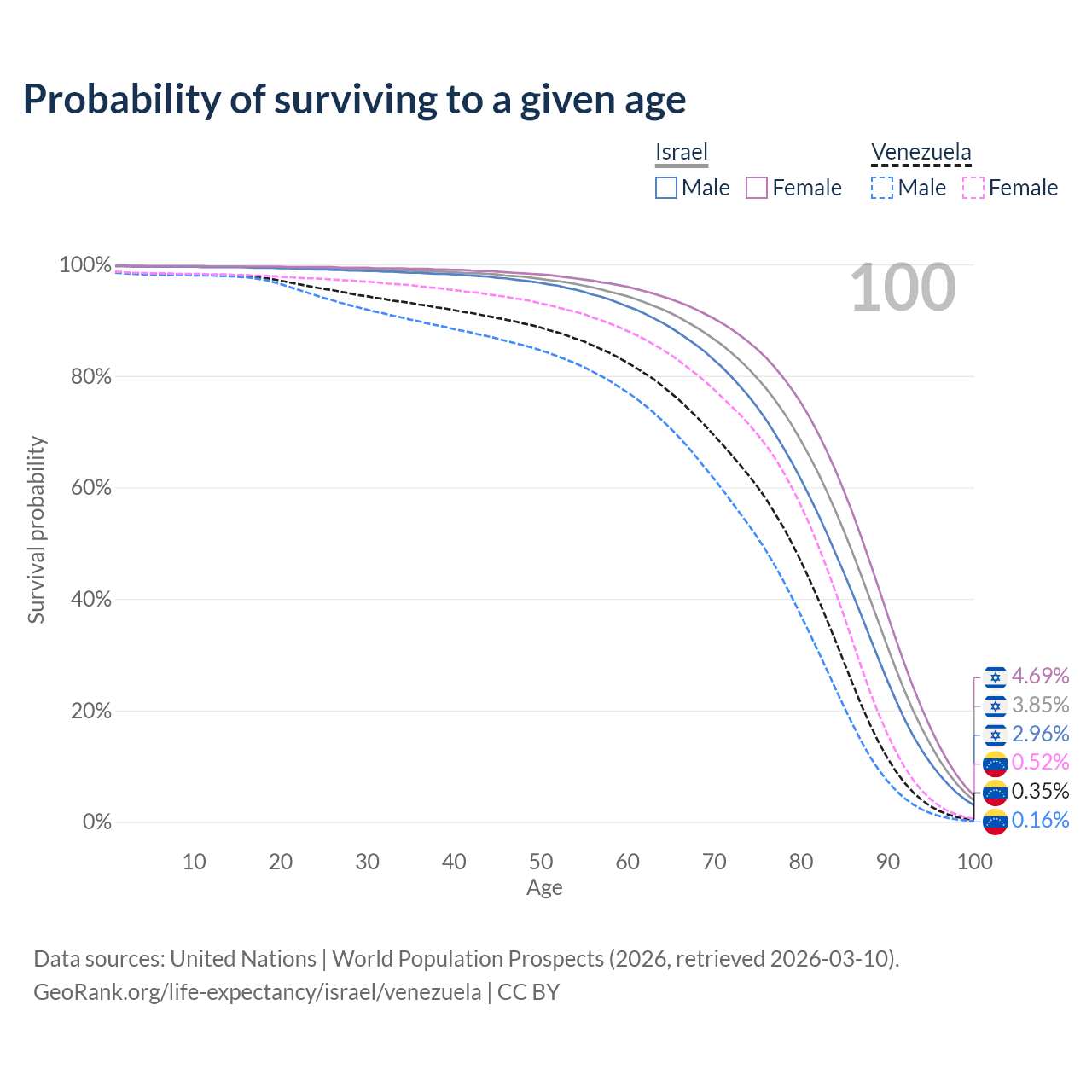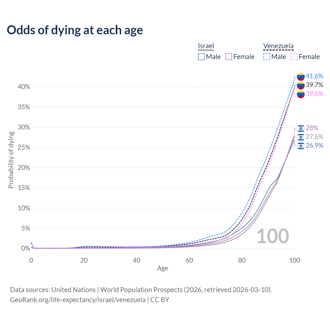 This life expectancy calculator shows the odds of living to 100, 95, 90, and below based on current age for both males and females in Israel and Venezuela, along with mean and median age of death. The calculations are based on the 2026 life tables (actuarial tables) from the UN World Population Prospects.