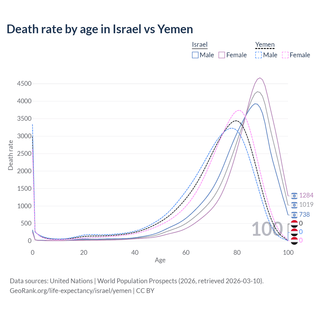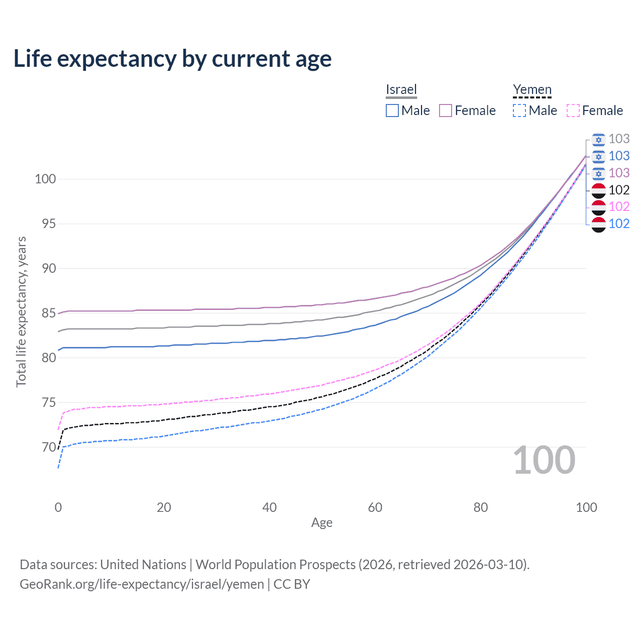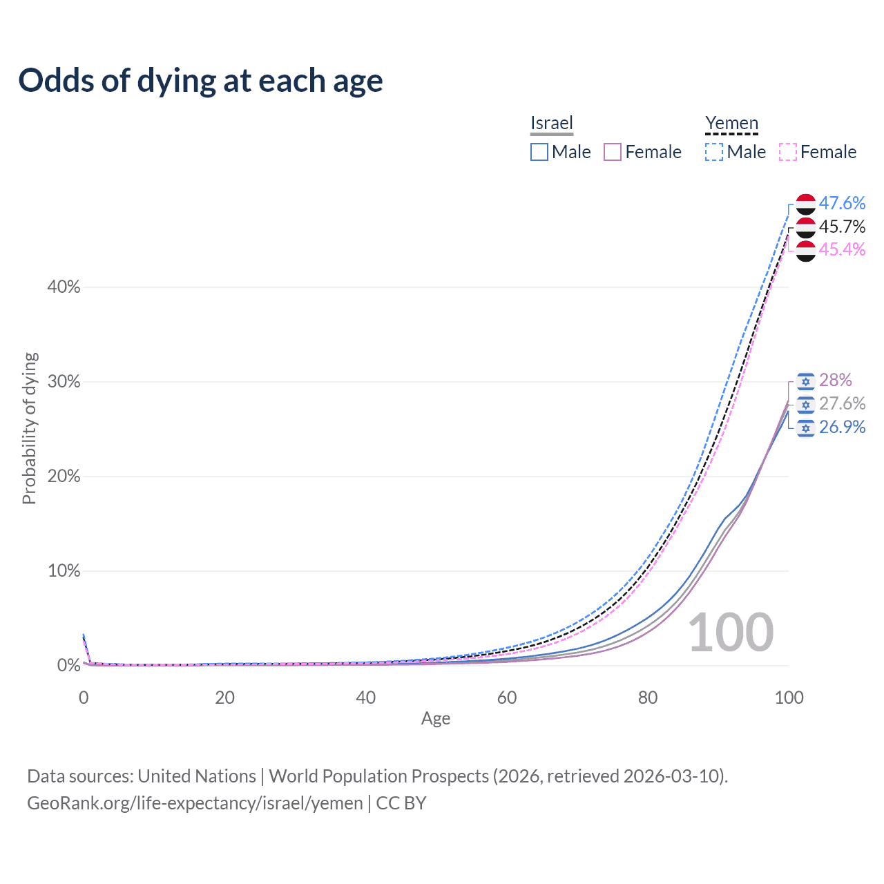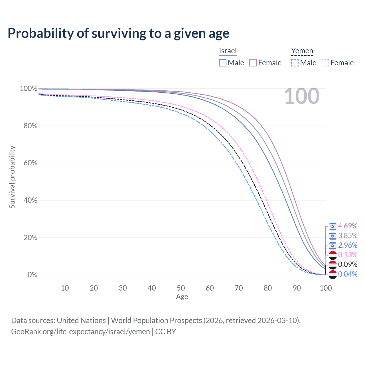 This life expectancy calculator shows the odds of living to 100, 95, 90, and below based on current age for both males and females in Israel and Yemen, along with mean and median age of death. The calculations are based on the 2026 life tables (actuarial tables) from the UN World Population Prospects.