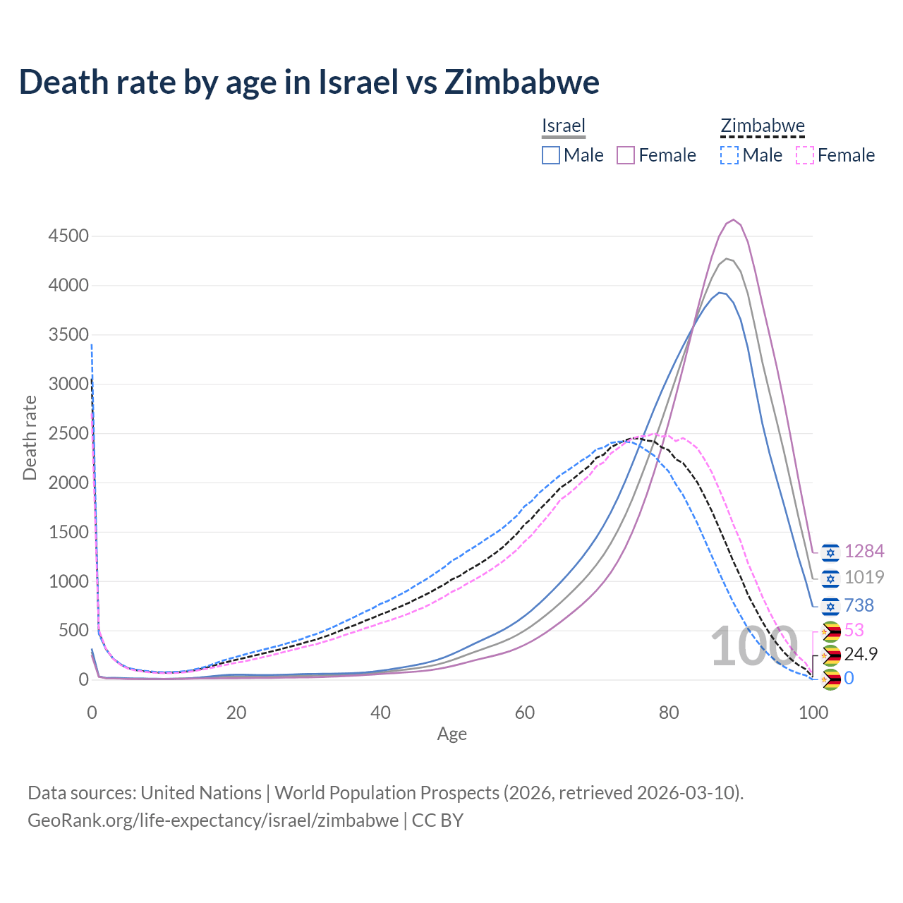In Israel, the most common age of death is 88, compared to 0 in Zimbabwe. The median age of death is 85.6 in Israel and 68.8 in Zimbabwe, meaning only half of each cohort is expected to live past that age.