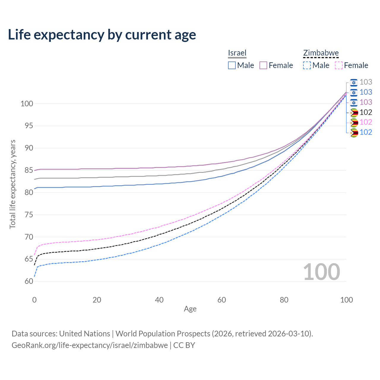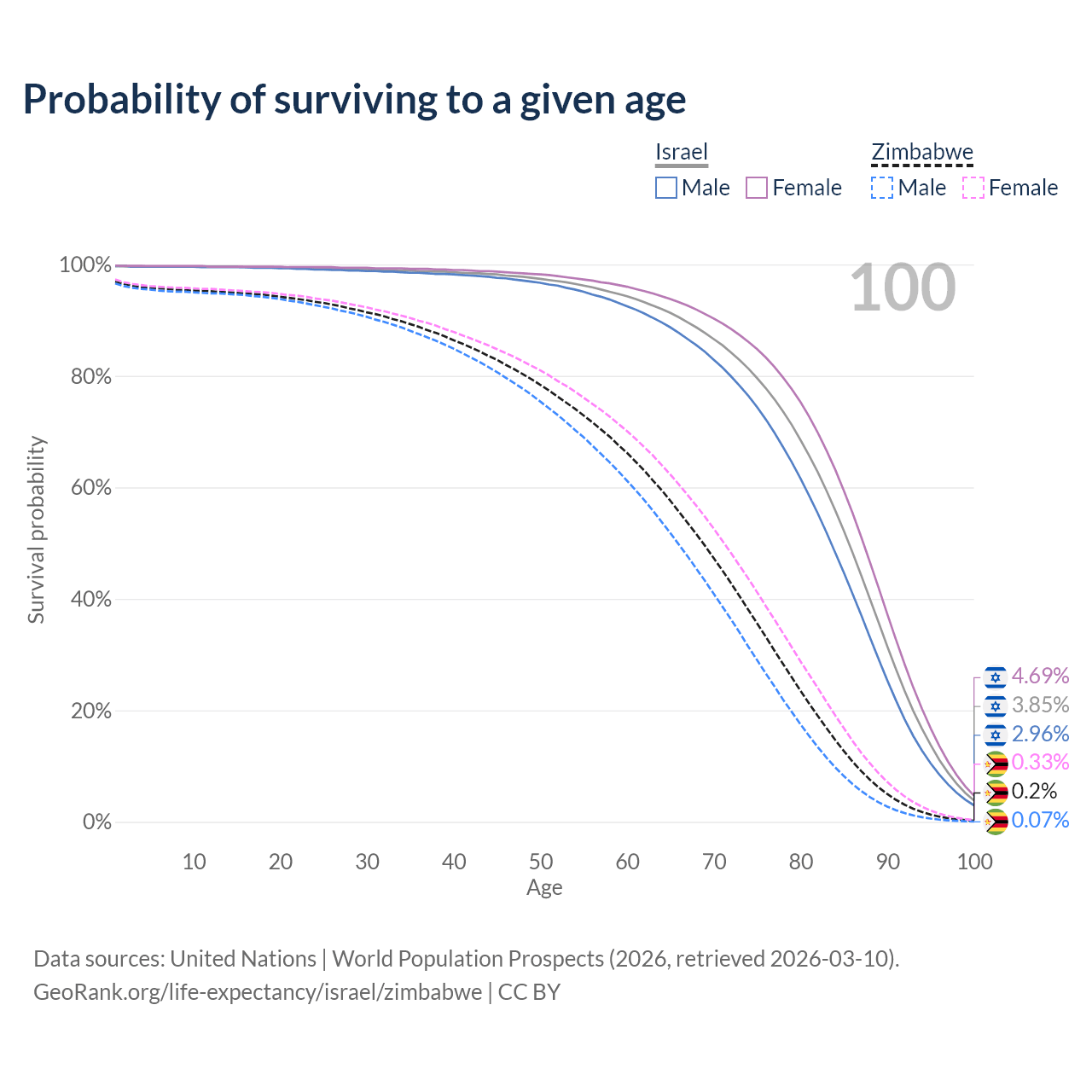 This life expectancy calculator shows the odds of living to 100, 95, 90, and below based on current age for both males and females in Israel and Zimbabwe, along with mean and median age of death. The calculations are based on the 2026 life tables (actuarial tables) from the UN World Population Prospects.