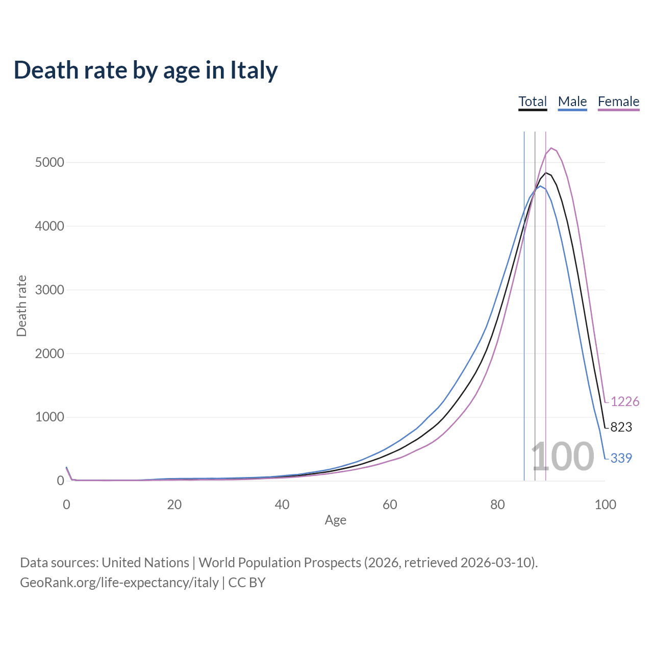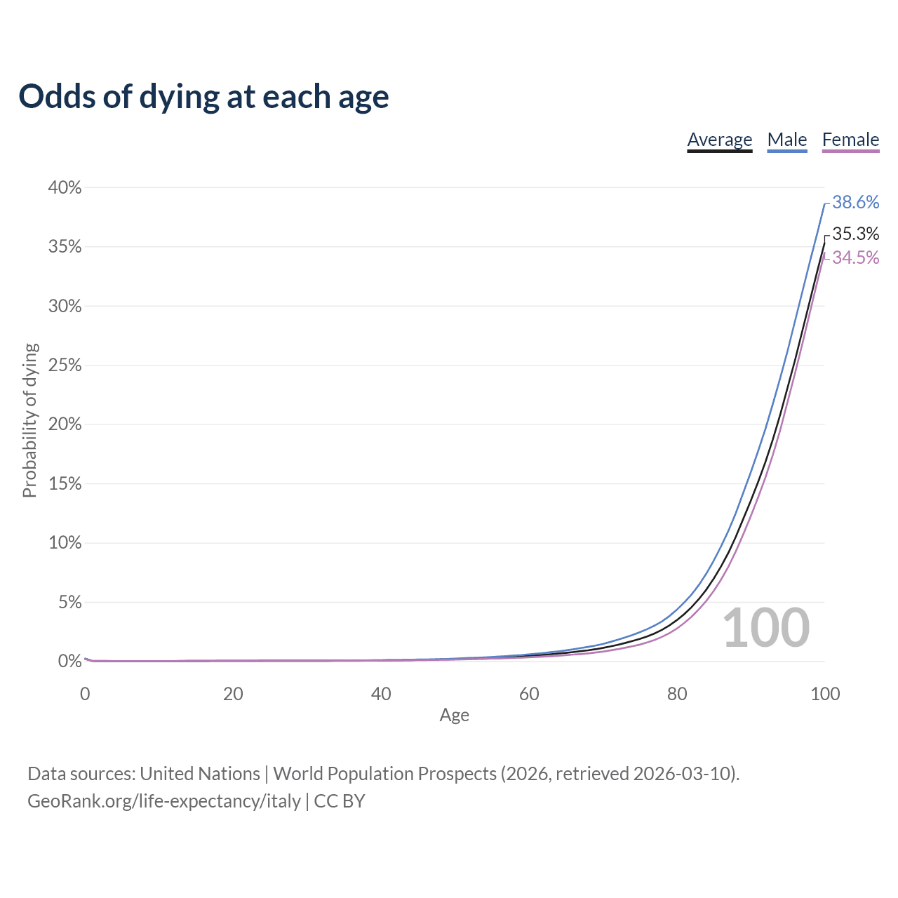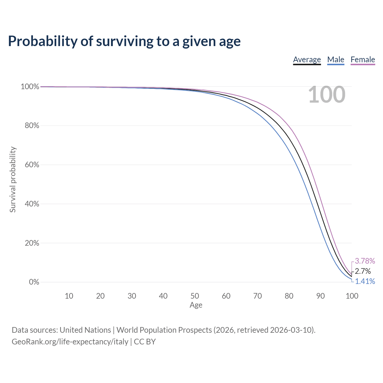 This life expectancy calculator shows the odds of living to 100, 95, 90, and below based on current age for both males and females in Italy, along with mean and median age of death. The calculations are based on the 2026 life tables (actuarial tables) from the UN World Population Prospects.
