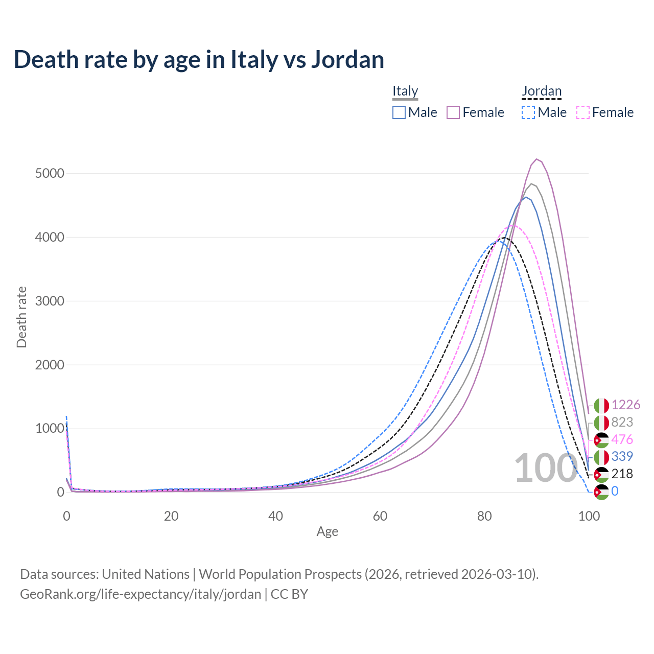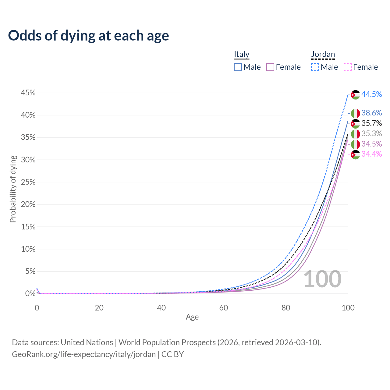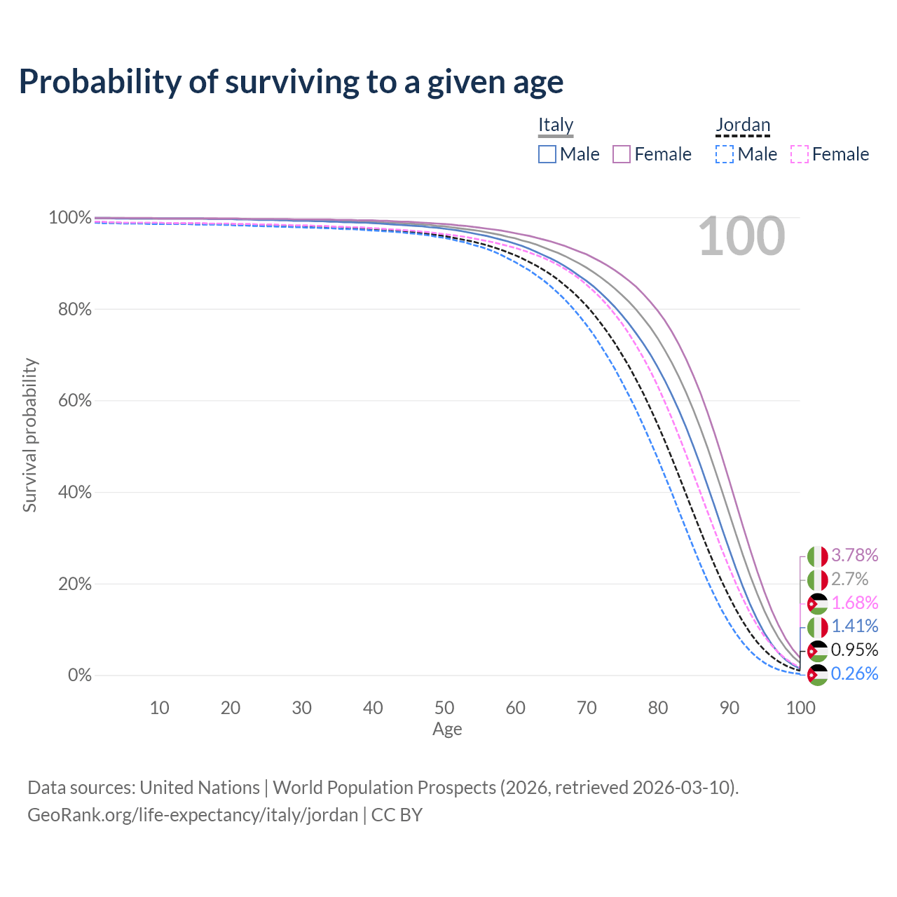 This life expectancy calculator shows the odds of living to 100, 95, 90, and below based on current age for both males and females in Italy and Jordan, along with mean and median age of death. The calculations are based on the 2026 life tables (actuarial tables) from the UN World Population Prospects.