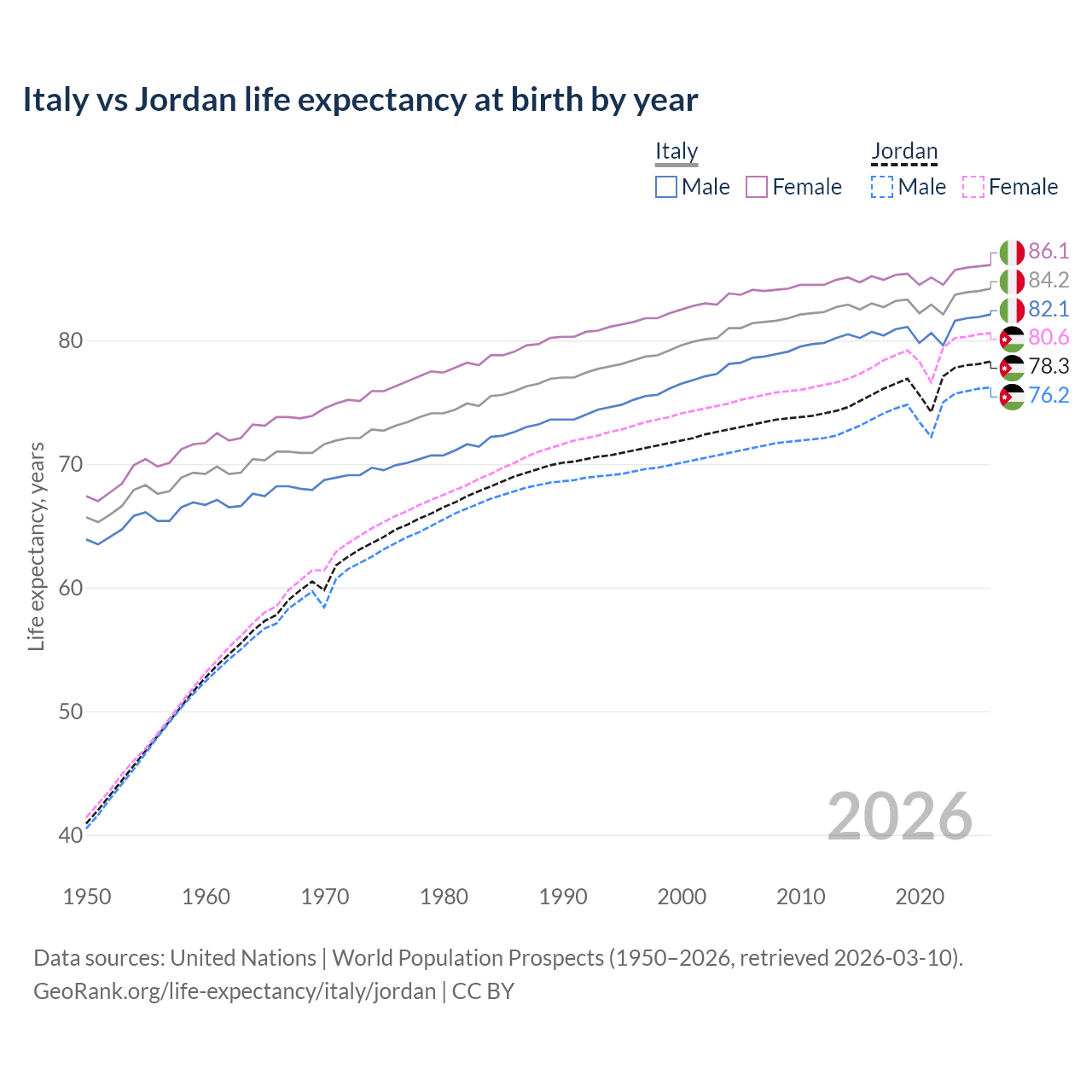 The average life expectancy at birth is 84.2 years in Italy vs 78.3 in Jordan. Italy is ranked 8/197 by life expectancy, and Jordan is 58/197. In Italy, the life expectancy is 82.1 years for males and 86.1 years for females. In Jordan, it's 76.2 years for males and 80.6 years for females.