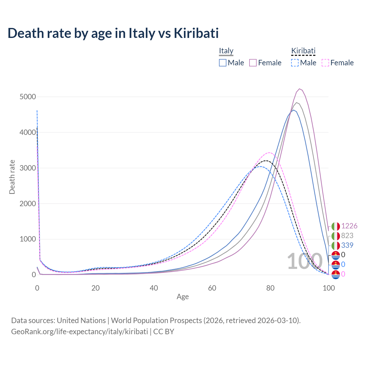 In Italy, the most common age of death is 89, compared to 0 in Kiribati. The median age of death is 86.9 in Italy and 73.1 in Kiribati, meaning only half of each cohort is expected to live past that age.