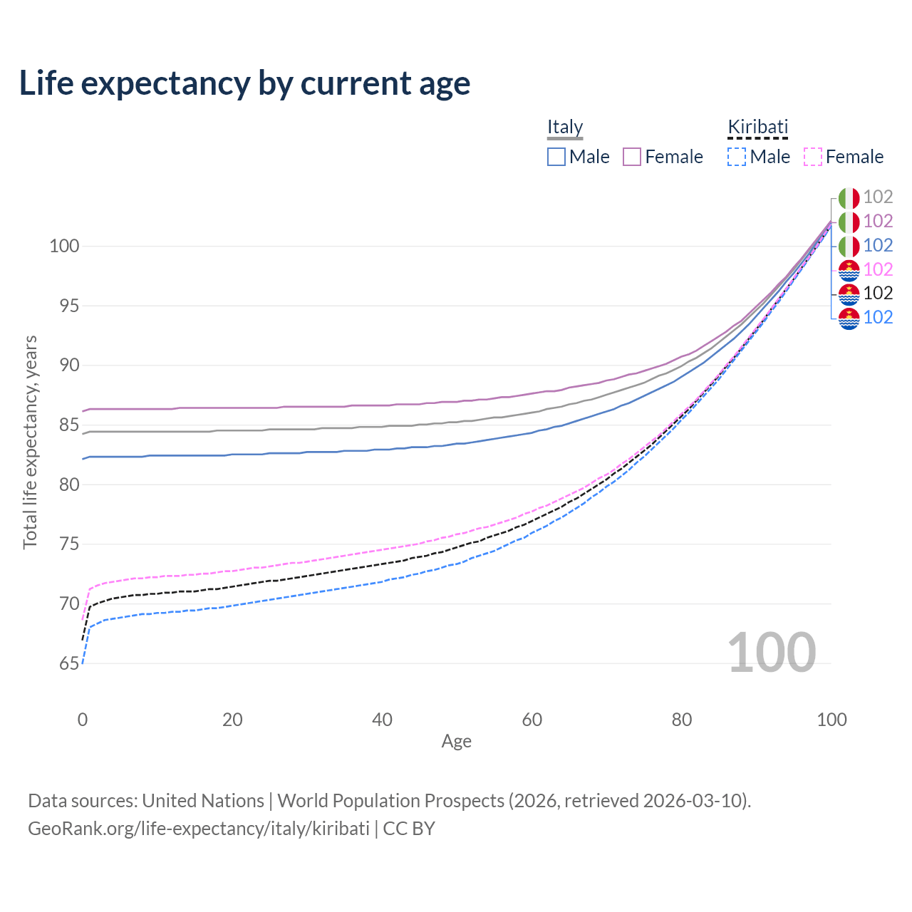 This life expectancy calculator shows the odds of living to 100, 95, 90, and below based on current age for both males and females in Italy and Kiribati, along with mean and median age of death. The calculations are based on the 2026 life tables (actuarial tables) from the UN World Population Prospects.