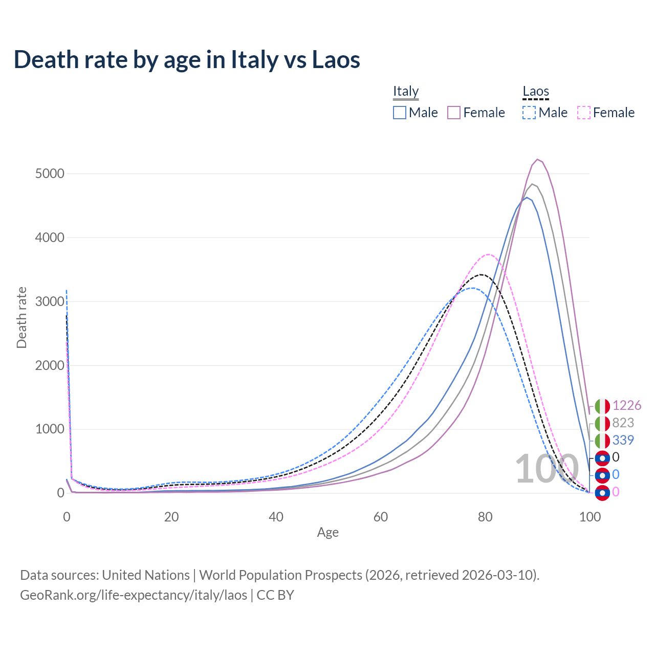 This life expectancy calculator shows the odds of living to 100, 95, 90, and below based on current age for both males and females in Italy and Laos, along with mean and median age of death. The calculations are based on the 2026 life tables (actuarial tables) from the UN World Population Prospects.