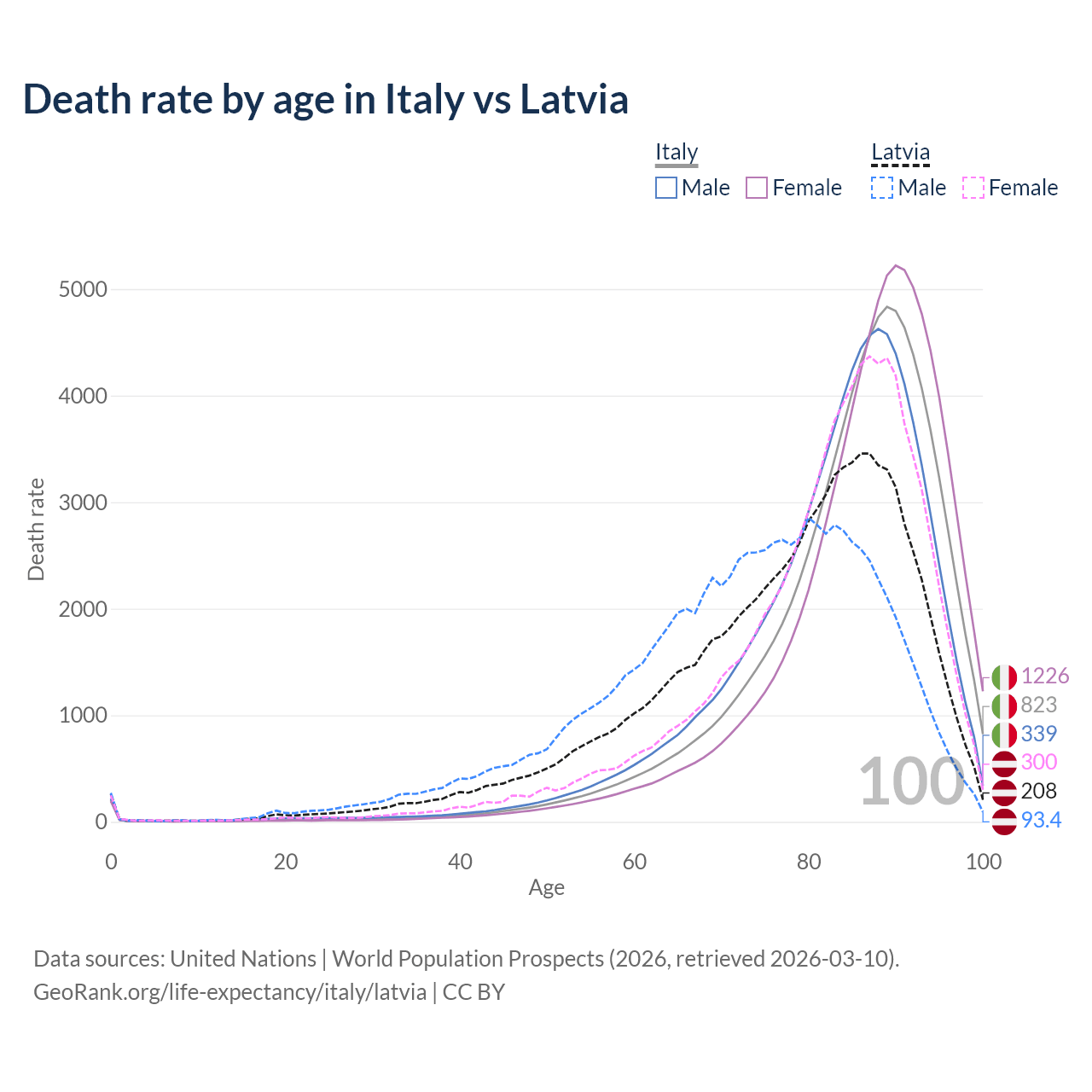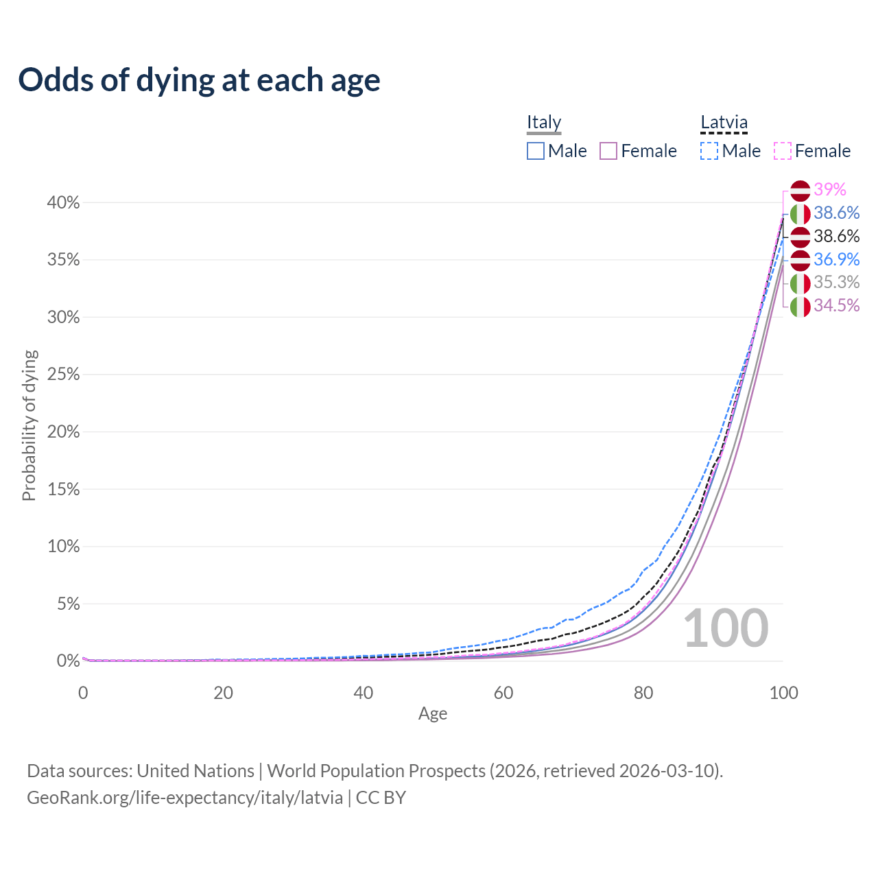 This life expectancy calculator shows the odds of living to 100, 95, 90, and below based on current age for both males and females in Italy and Latvia, along with mean and median age of death. The calculations are based on the 2026 life tables (actuarial tables) from the UN World Population Prospects.