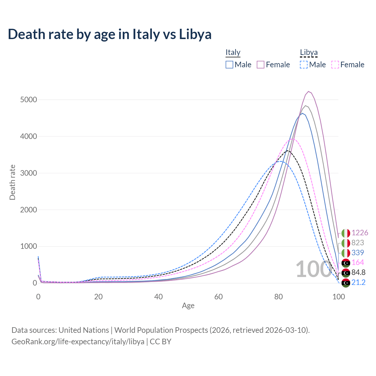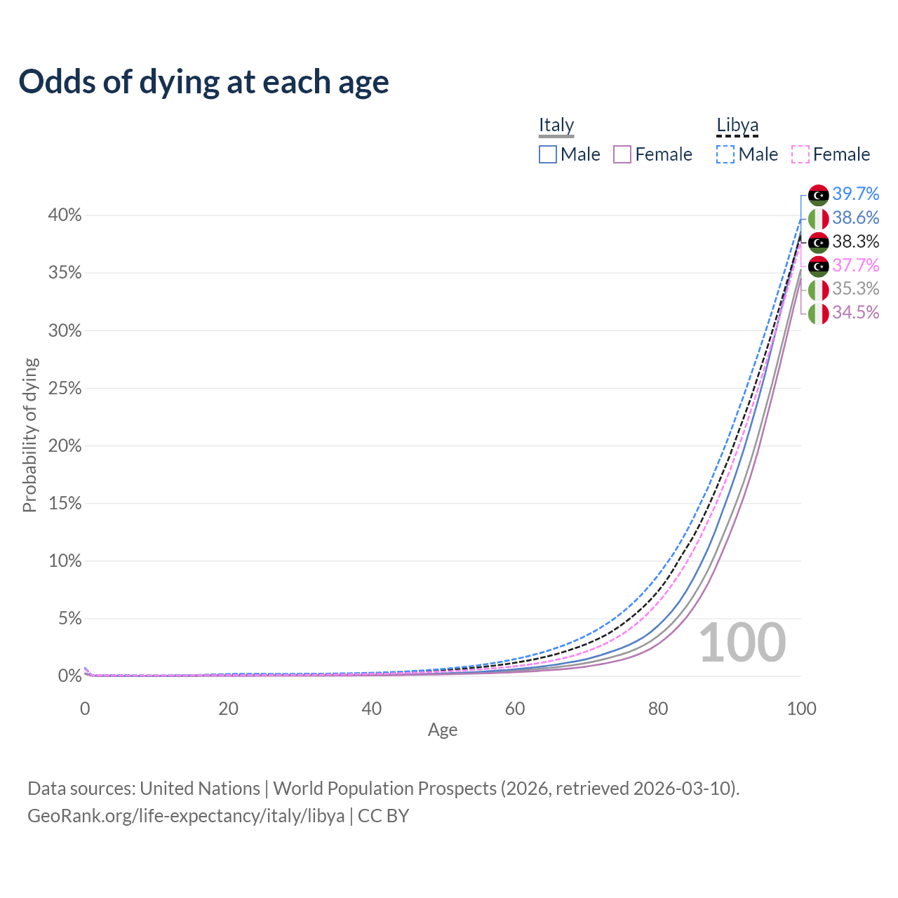 This life expectancy calculator shows the odds of living to 100, 95, 90, and below based on current age for both males and females in Italy and Libya, along with mean and median age of death. The calculations are based on the 2026 life tables (actuarial tables) from the UN World Population Prospects.