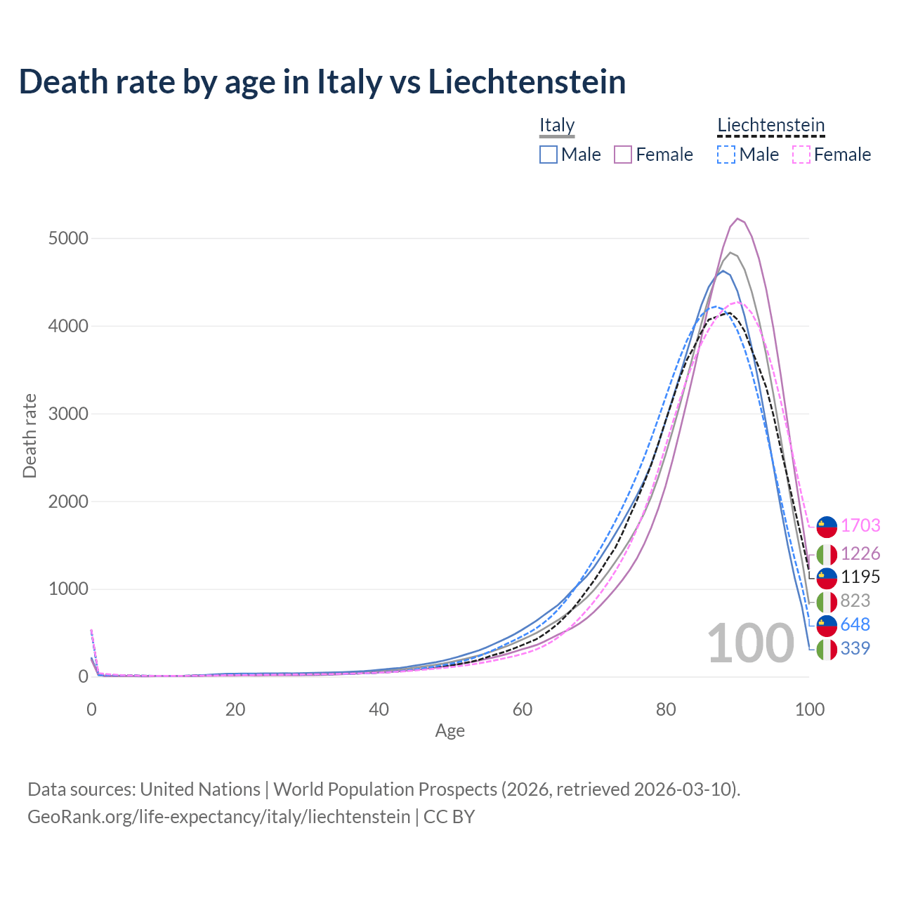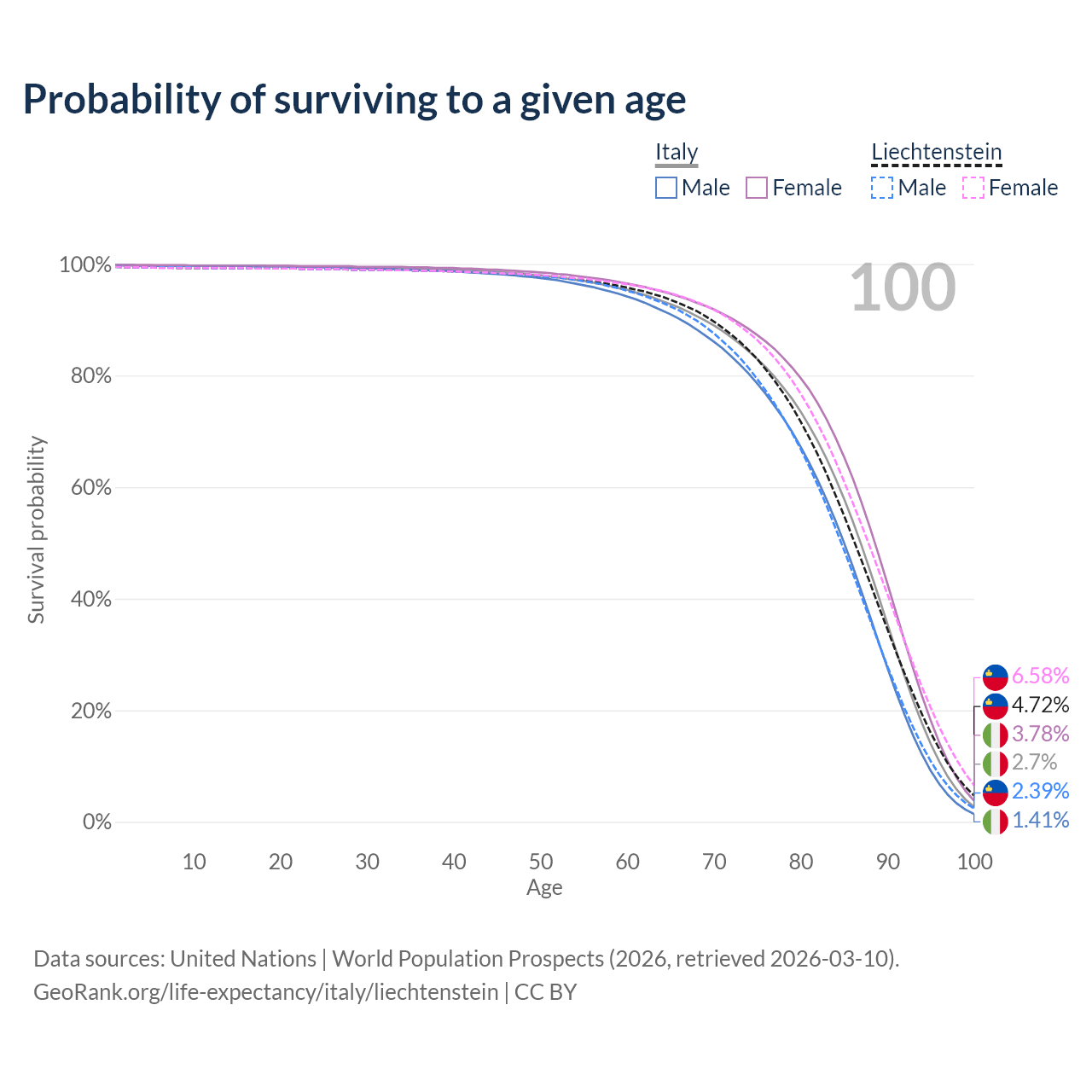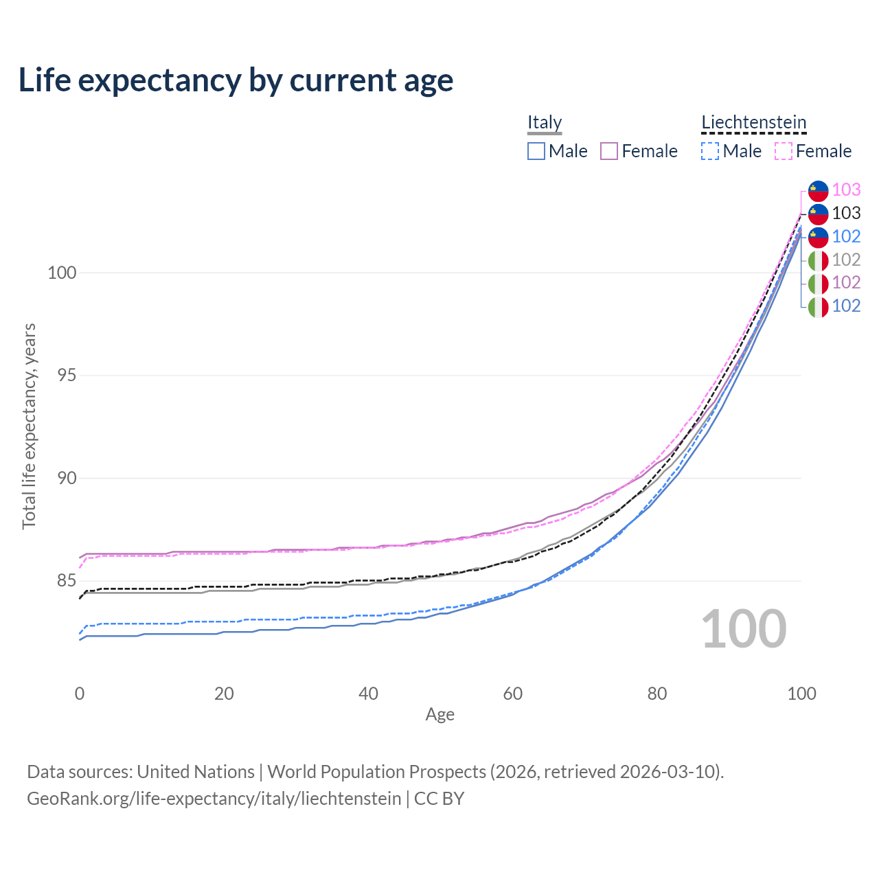 This life expectancy calculator shows the odds of living to 100, 95, 90, and below based on current age for both males and females in Italy and Liechtenstein, along with mean and median age of death. The calculations are based on the 2026 life tables (actuarial tables) from the UN World Population Prospects.