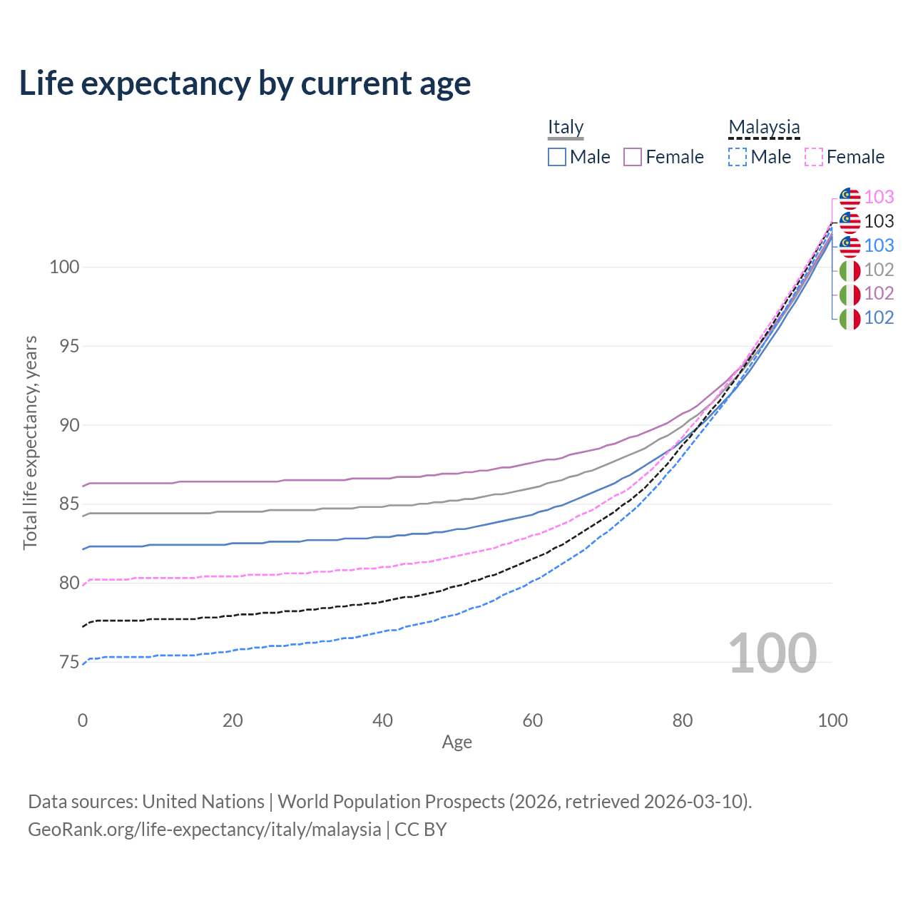 This life expectancy calculator shows the odds of living to 100, 95, 90, and below based on current age for both males and females in Italy and Malaysia, along with mean and median age of death. The calculations are based on the 2026 life tables (actuarial tables) from the UN World Population Prospects.