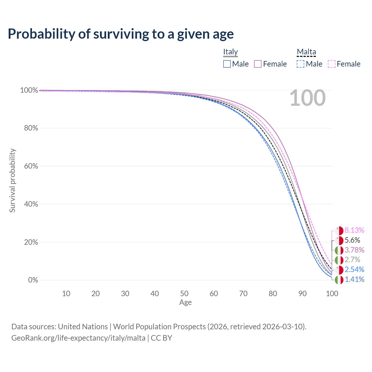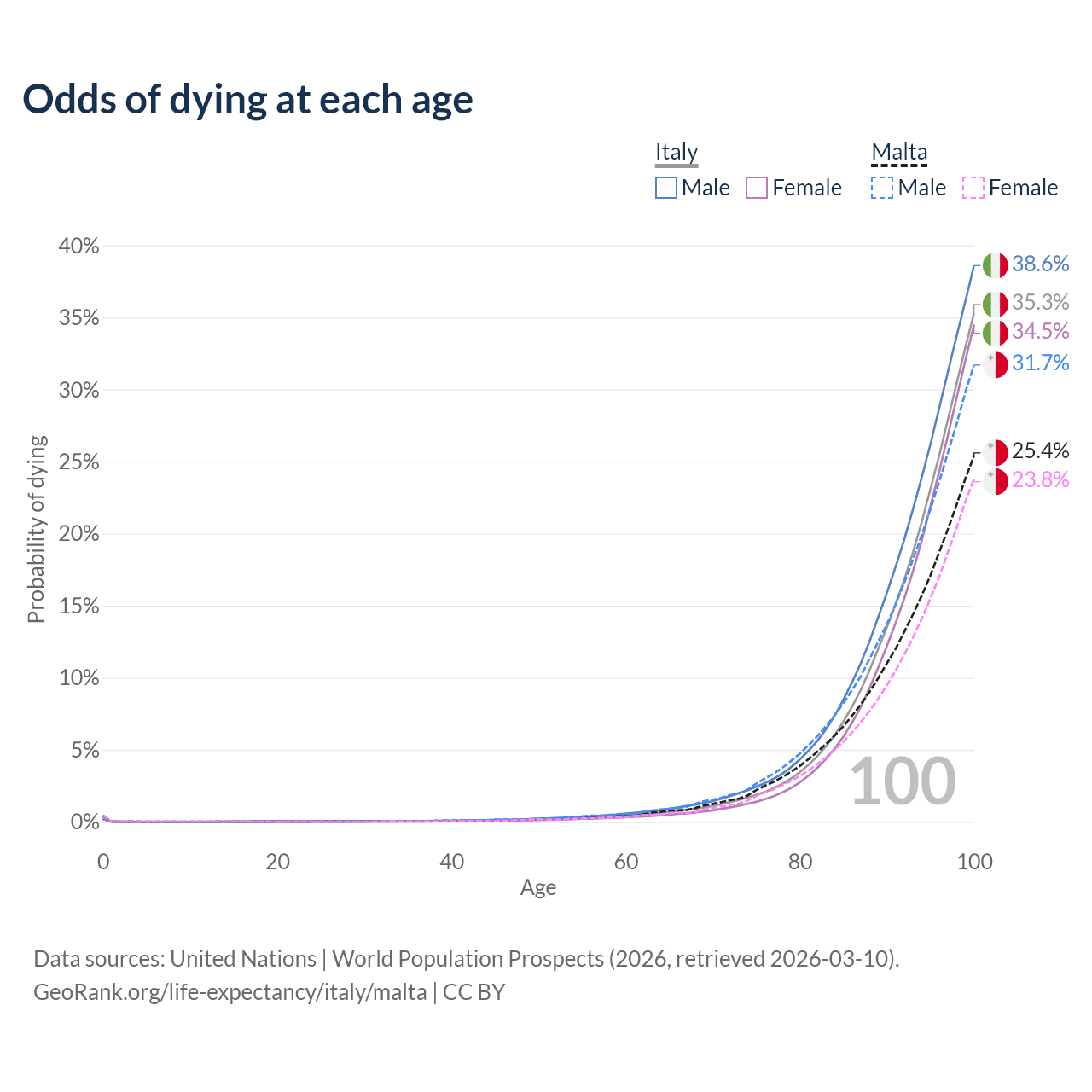 This life expectancy calculator shows the odds of living to 100, 95, 90, and below based on current age for both males and females in Italy and Malta, along with mean and median age of death. The calculations are based on the 2026 life tables (actuarial tables) from the UN World Population Prospects.