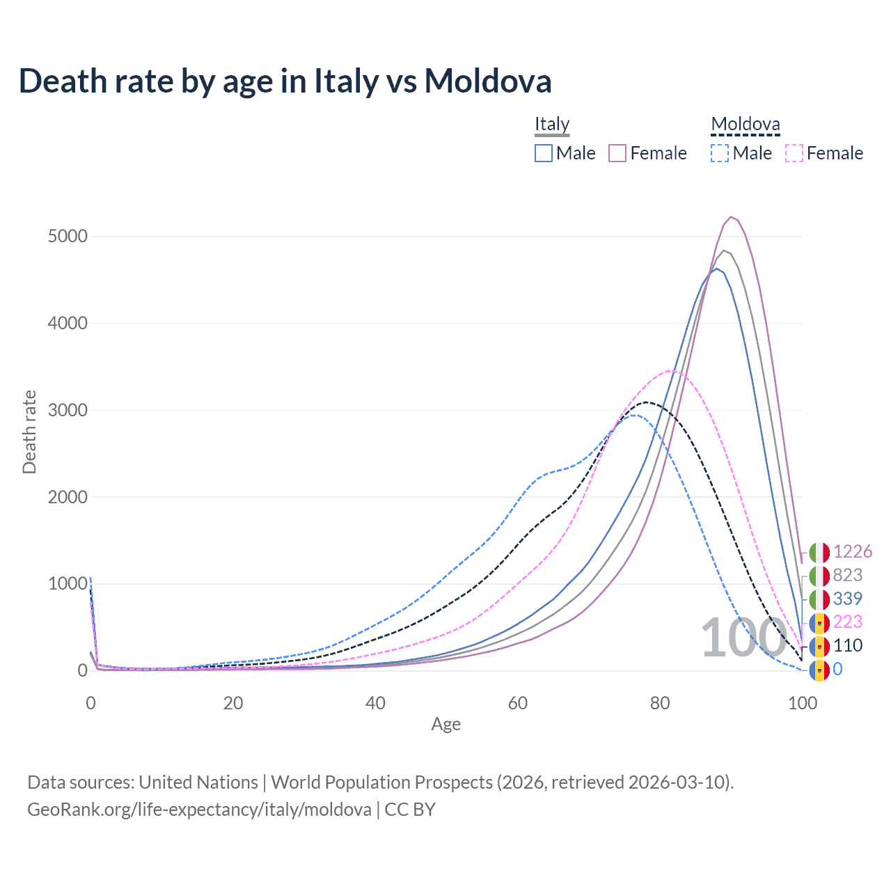 In Italy, the most common age of death is 89, compared to 78 in Moldova. The median age of death is 86.9 in Italy and 74.8 in Moldova, meaning only half of each cohort is expected to live past that age.