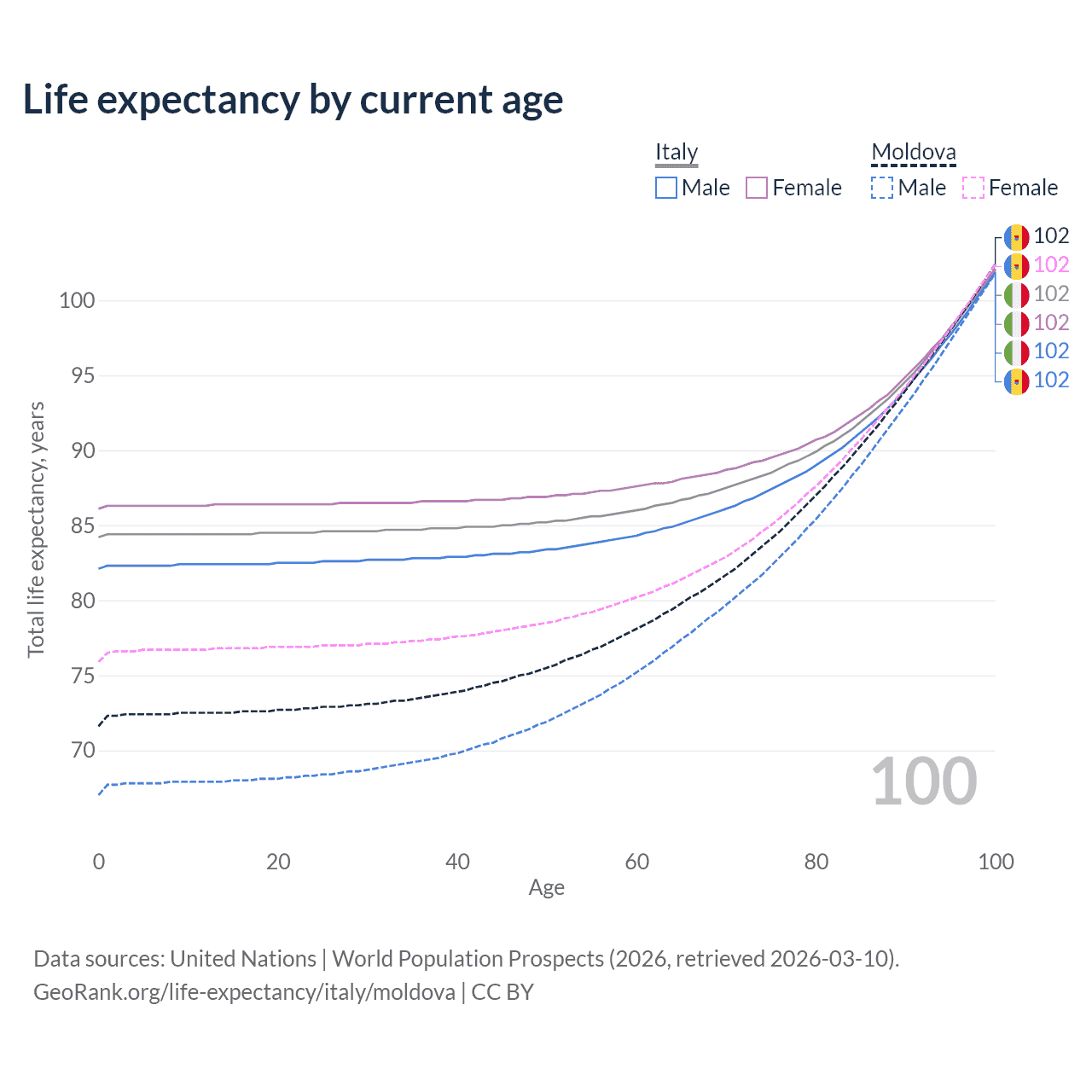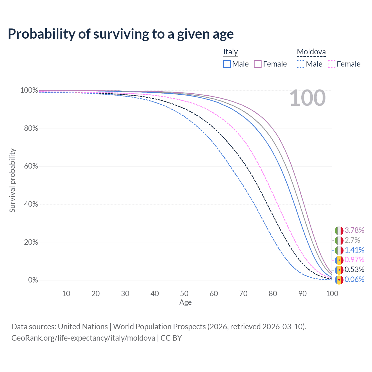 This life expectancy calculator shows the odds of living to 100, 95, 90, and below based on current age for both males and females in Italy and Moldova, along with mean and median age of death. The calculations are based on the 2026 life tables (actuarial tables) from the UN World Population Prospects.