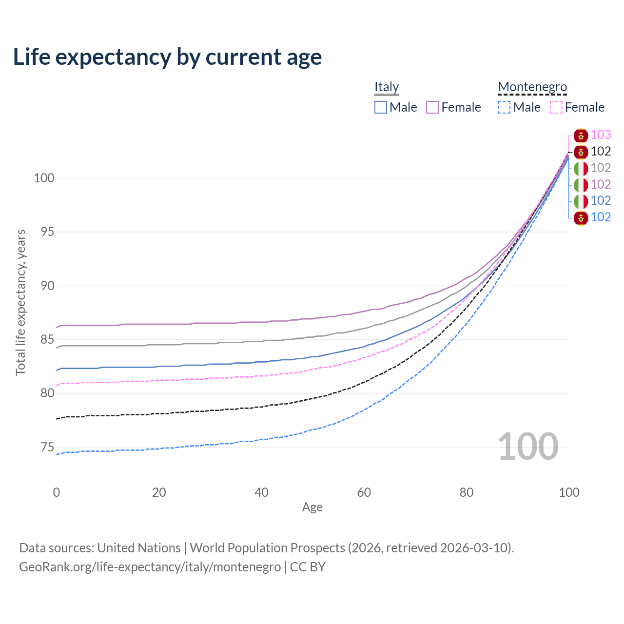 This life expectancy calculator shows the odds of living to 100, 95, 90, and below based on current age for both males and females in Italy and Montenegro, along with mean and median age of death. The calculations are based on the 2026 life tables (actuarial tables) from the UN World Population Prospects.