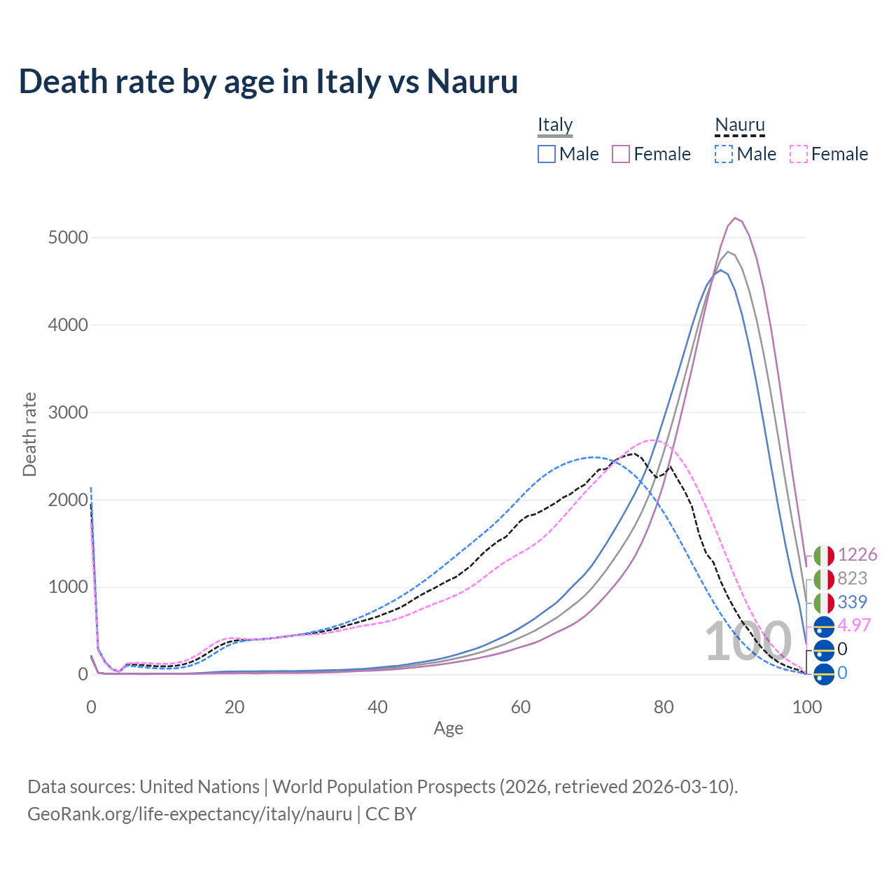 In Italy, the most common age of death is 89, compared to 76 in Nauru. The median age of death is 86.9 in Italy and 67.3 in Nauru, meaning only half of each cohort is expected to live past that age.