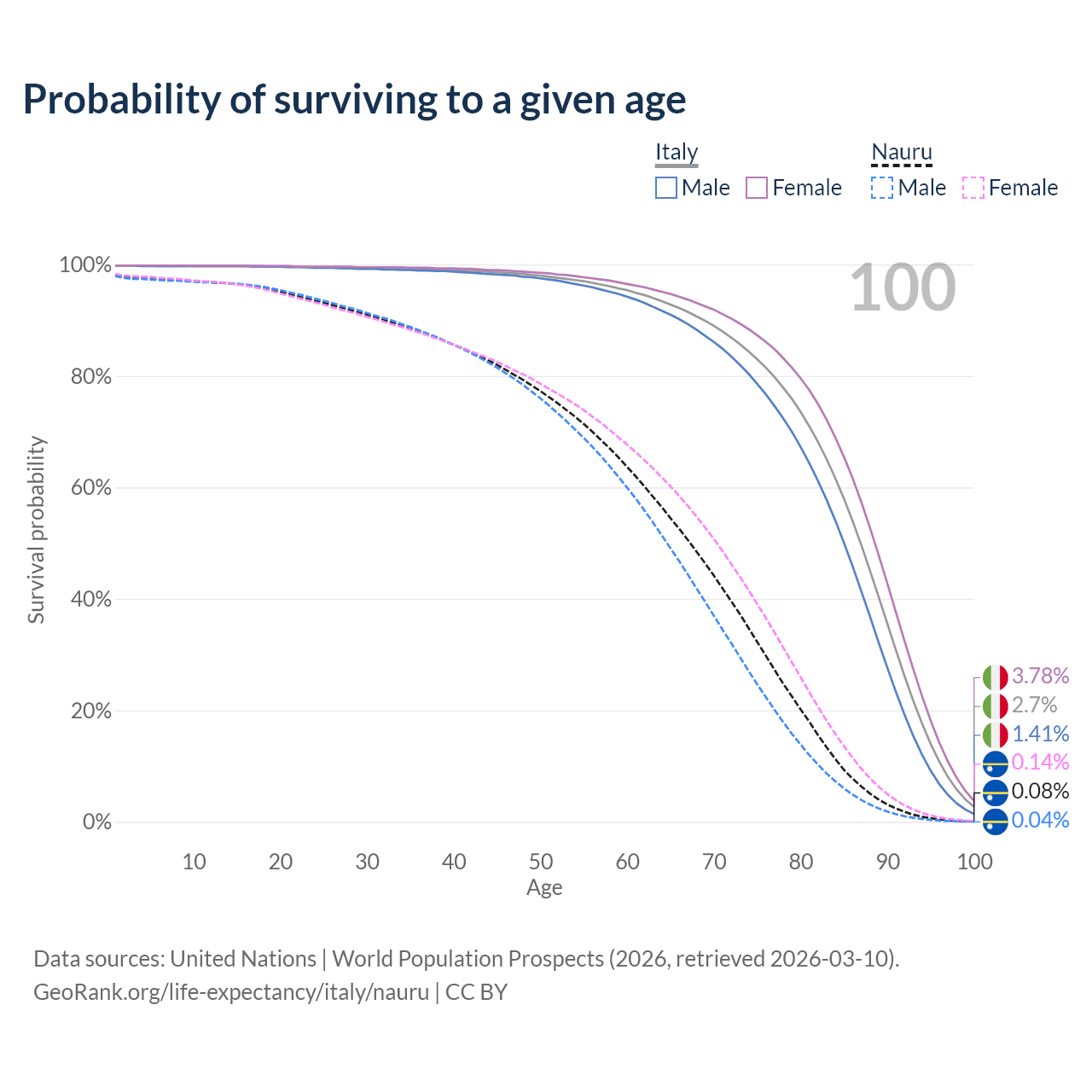 This life expectancy calculator shows the odds of living to 100, 95, 90, and below based on current age for both males and females in Italy and Nauru, along with mean and median age of death. The calculations are based on the 2026 life tables (actuarial tables) from the UN World Population Prospects.