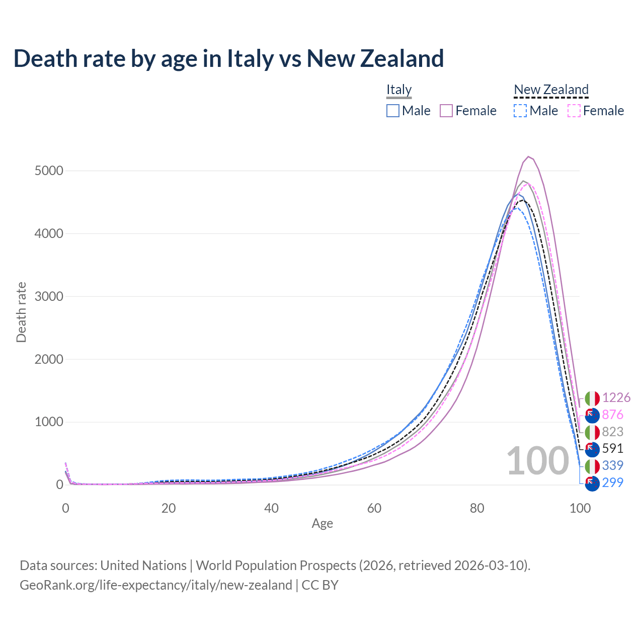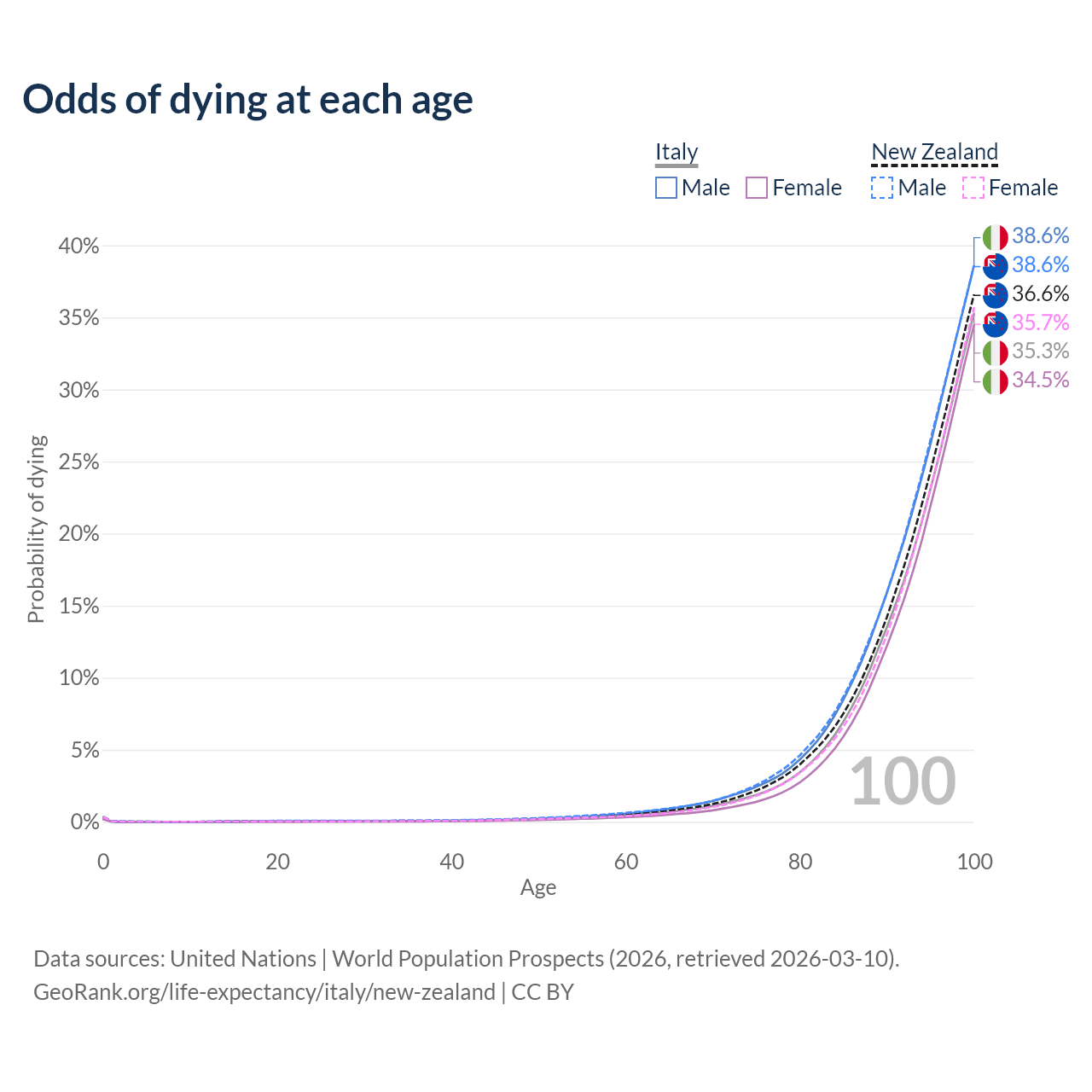 This life expectancy calculator shows the odds of living to 100, 95, 90, and below based on current age for both males and females in Italy and New Zealand, along with mean and median age of death. The calculations are based on the 2026 life tables (actuarial tables) from the UN World Population Prospects.