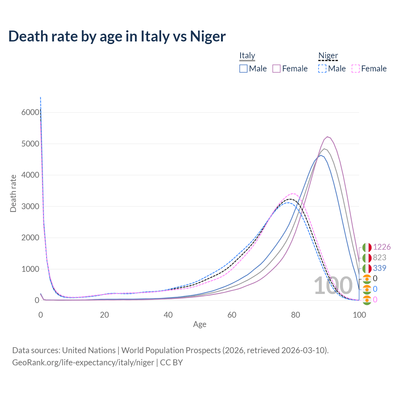 In Italy, the most common age of death is 89, compared to 0 in Niger. The median age of death is 86.9 in Italy and 71.7 in Niger, meaning only half of each cohort is expected to live past that age.