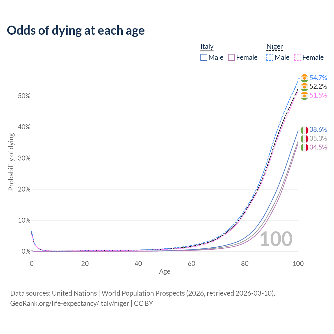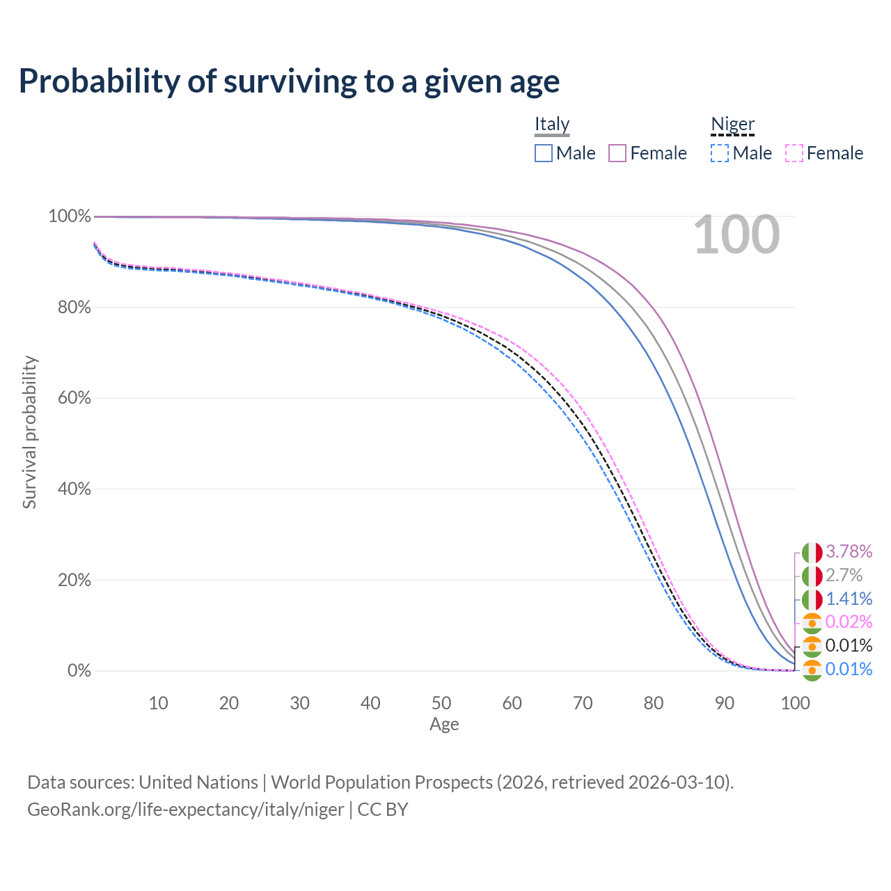 This life expectancy calculator shows the odds of living to 100, 95, 90, and below based on current age for both males and females in Italy and Niger, along with mean and median age of death. The calculations are based on the 2026 life tables (actuarial tables) from the UN World Population Prospects.