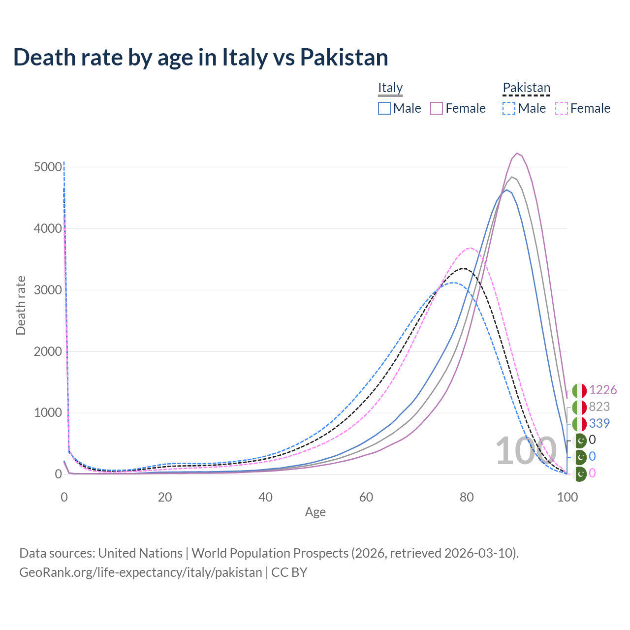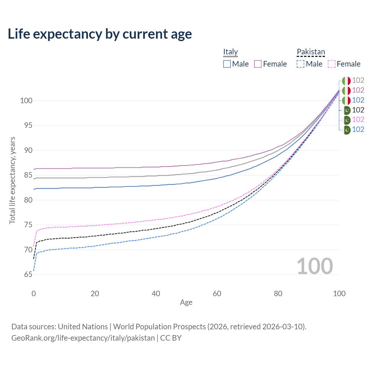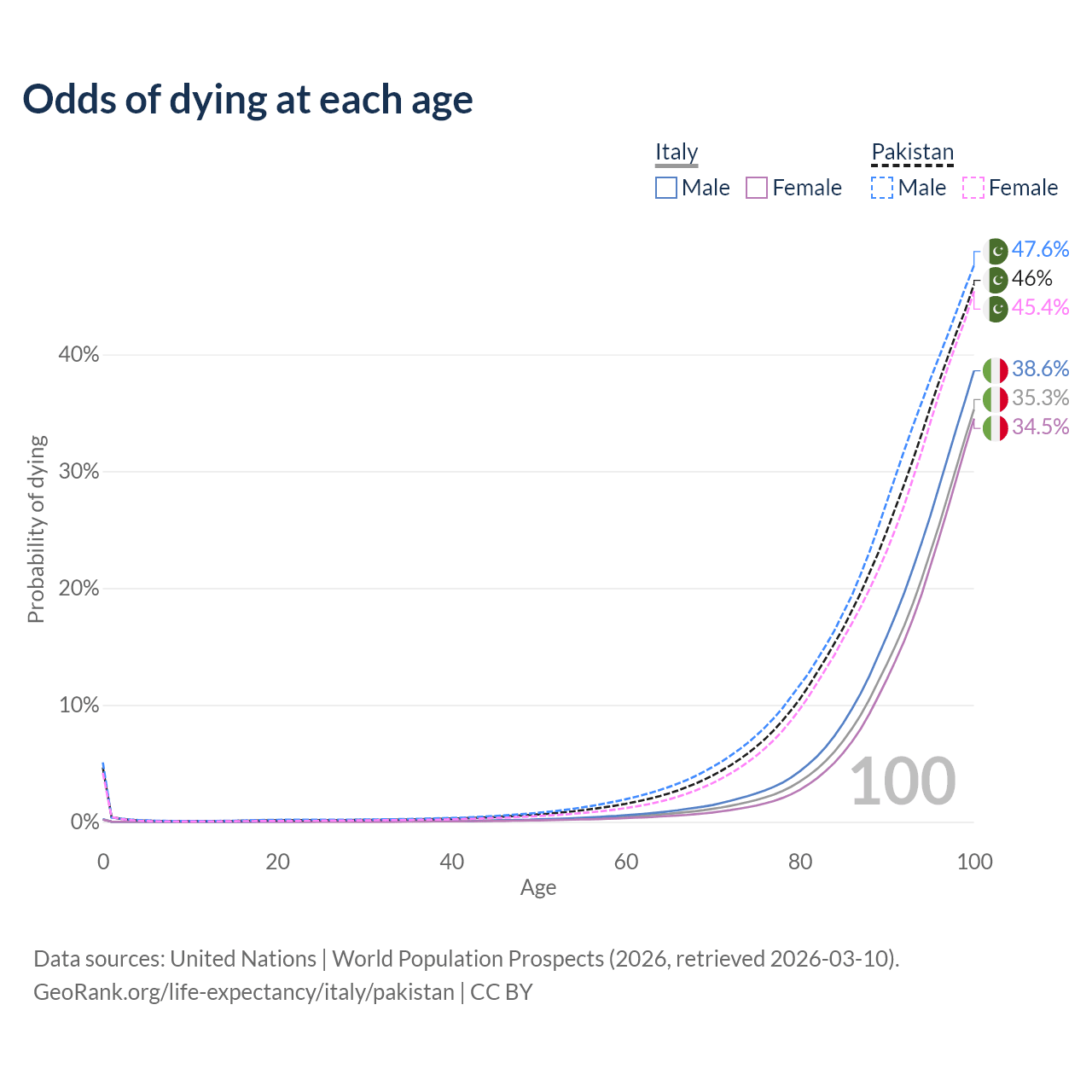 This life expectancy calculator shows the odds of living to 100, 95, 90, and below based on current age for both males and females in Italy and Pakistan, along with mean and median age of death. The calculations are based on the 2026 life tables (actuarial tables) from the UN World Population Prospects.