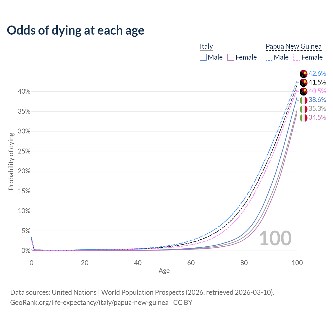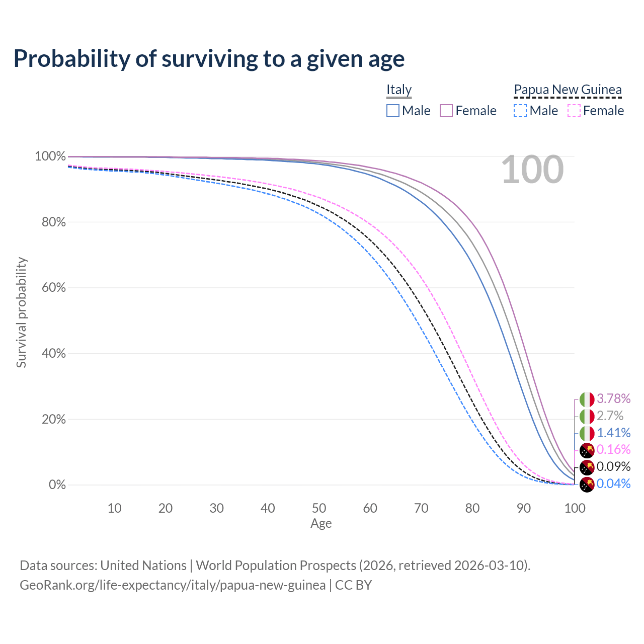 This life expectancy calculator shows the odds of living to 100, 95, 90, and below based on current age for both males and females in Italy and Papua New Guinea, along with mean and median age of death. The calculations are based on the 2026 life tables (actuarial tables) from the UN World Population Prospects.