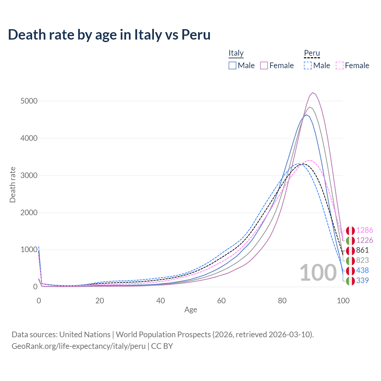 In Italy, the most common age of death is 89, compared to 87 in Peru. The median age of death is 86.9 in Italy and 82.4 in Peru, meaning only half of each cohort is expected to live past that age.