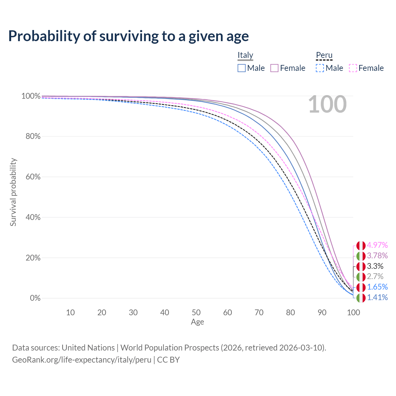 This life expectancy calculator shows the odds of living to 100, 95, 90, and below based on current age for both males and females in Italy and Peru, along with mean and median age of death. The calculations are based on the 2026 life tables (actuarial tables) from the UN World Population Prospects.