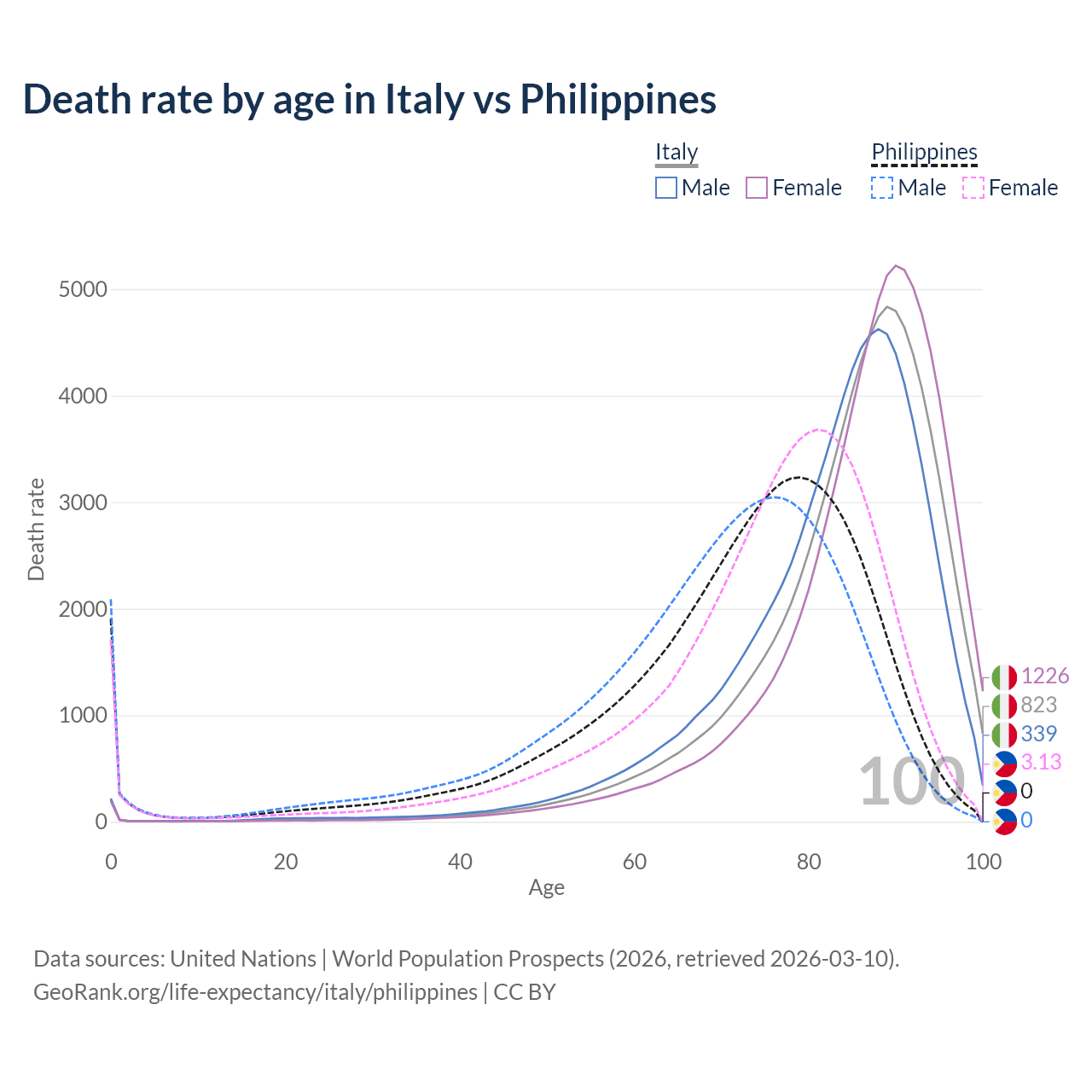 In Italy, the most common age of death is 89, compared to 79 in the Philippines. The median age of death is 86.9 in Italy and 74.6 in the Philippines, meaning only half of each cohort is expected to live past that age.