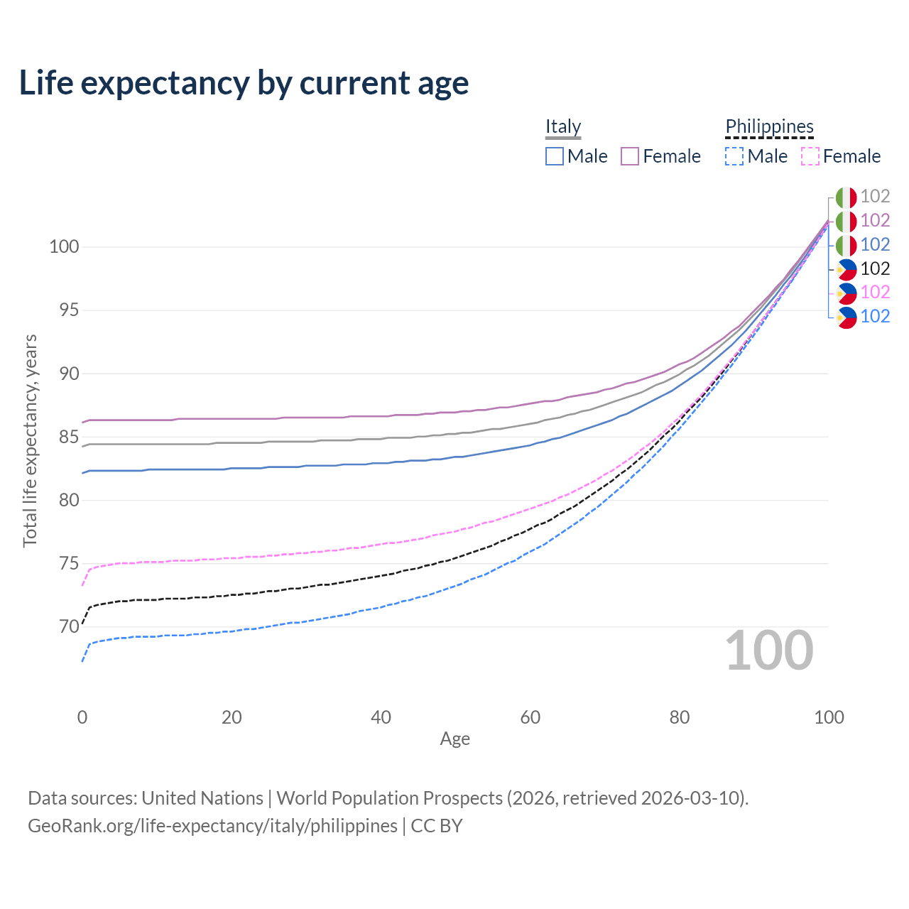 This life expectancy calculator shows the odds of living to 100, 95, 90, and below based on current age for both males and females in Italy and the Philippines, along with mean and median age of death. The calculations are based on the 2026 life tables (actuarial tables) from the UN World Population Prospects.