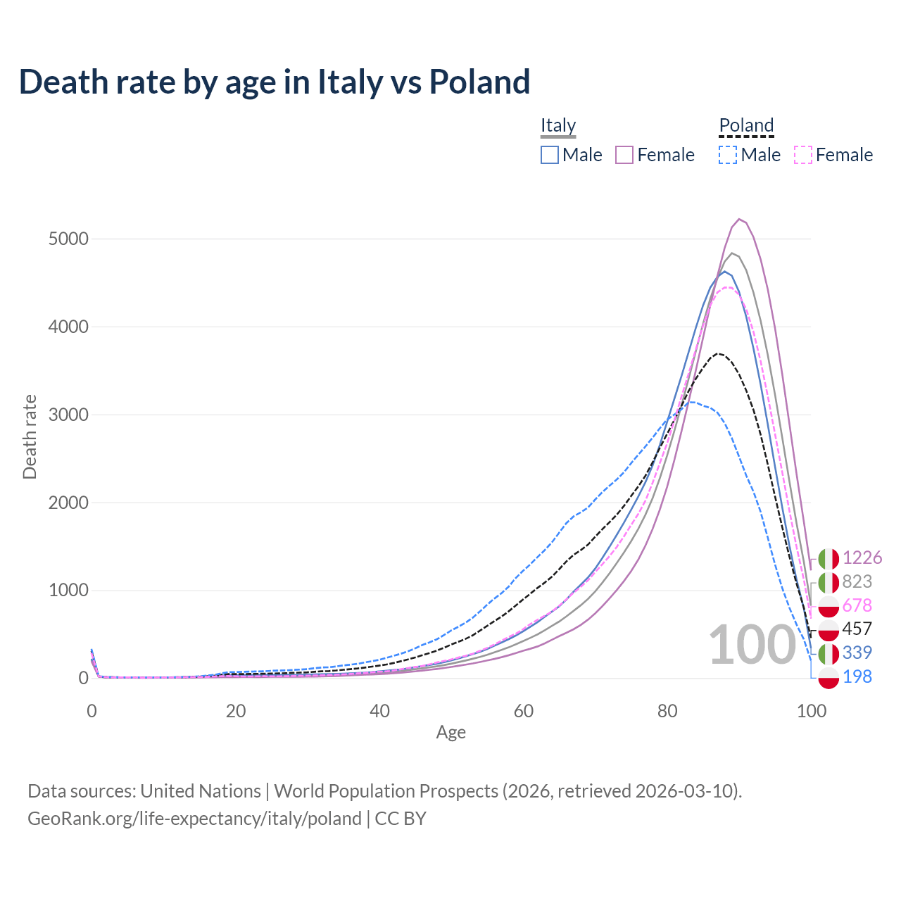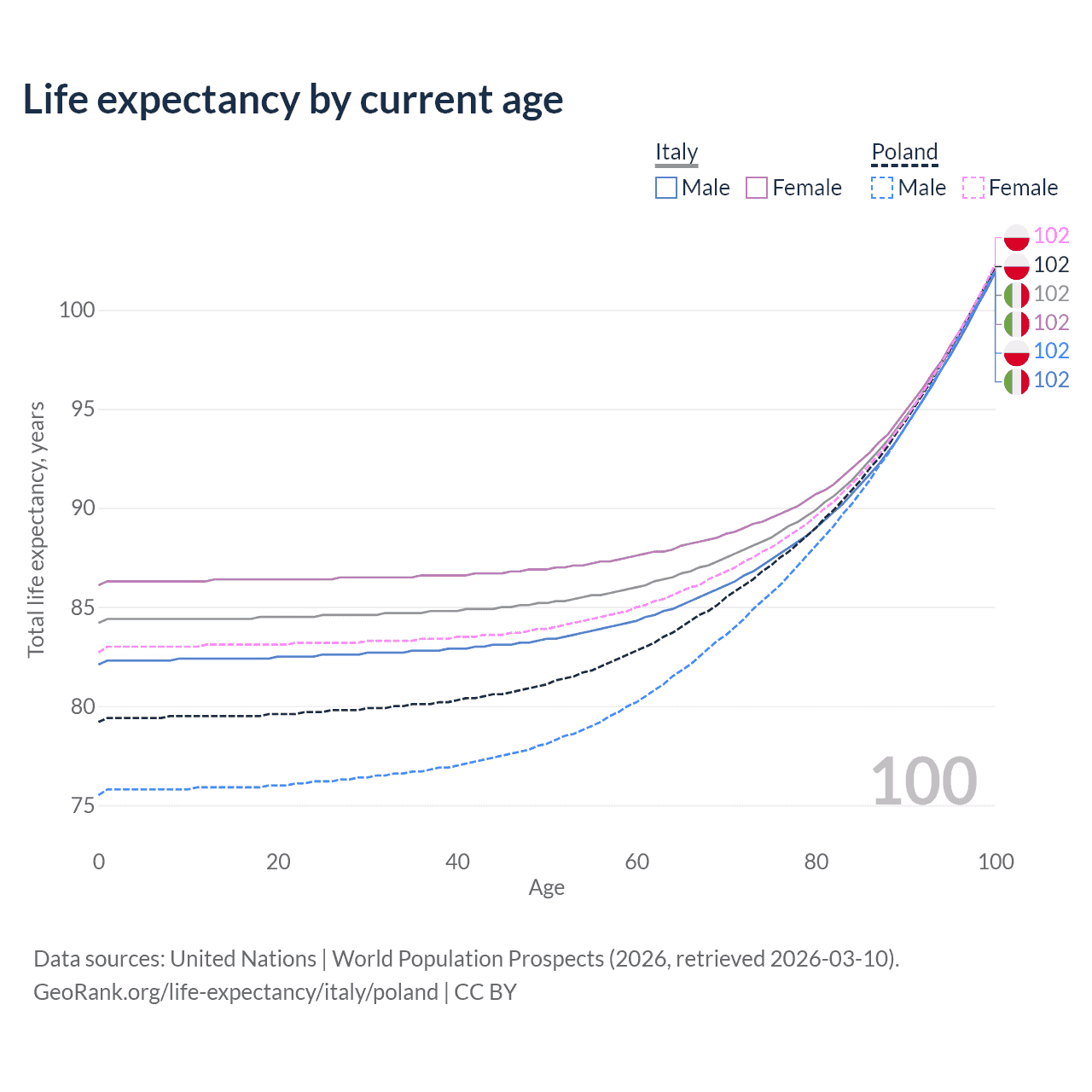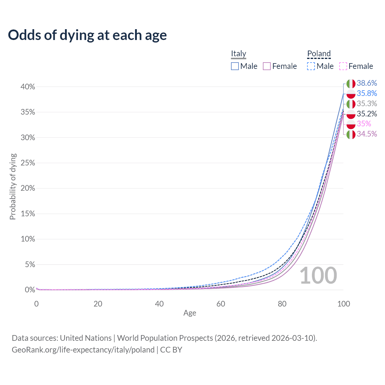 This life expectancy calculator shows the odds of living to 100, 95, 90, and below based on current age for both males and females in Italy and Poland, along with mean and median age of death. The calculations are based on the 2026 life tables (actuarial tables) from the UN World Population Prospects.
